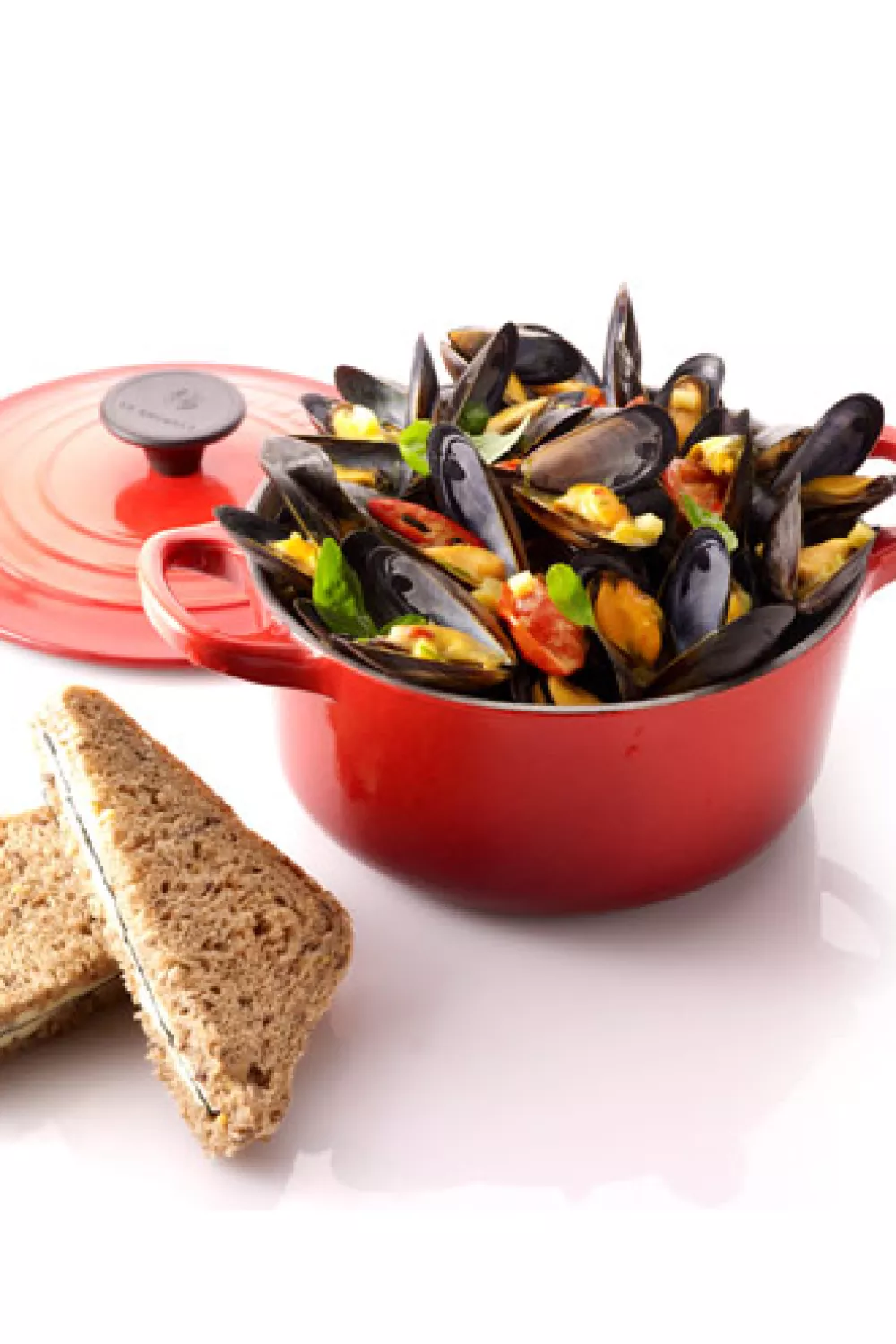 Fris en licht exotisch gerecht van bouchot mosselen in een romige kokosmelksaus met kurkuma, chili en een scheutje witte wijn. Kleine kerstomaatjes, blokjes mango en verse basilicum geven een zomerse, fruitige toets terwijl de mosselen zacht stomen tot ze open springen. Serveer met royaal beboterde sneetjes brood met fleur de sel en norivellen als smakelijk voorgerecht of luchtig hoofdgerecht voor een informele bijeenkomst.