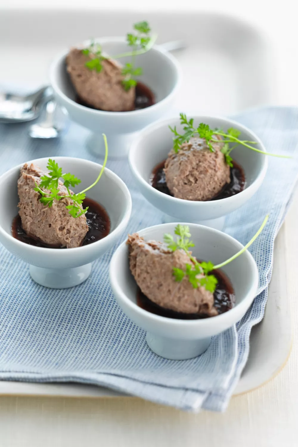 Maak met behulp van 2 eetlepels nootjes van de kwartelmousse en schik in een klein kommetje gevuld met pruimencompote.