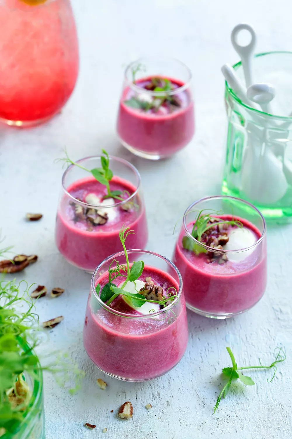 Zijdezachte mousse van rode biet en romige geitenkaas die in een handomdraai met de blender wordt gemaakt, ideaal als verfijnd aperitief of herfstig voorgerecht. De aardse zoetheid van bieten contrasteert met het frisse zuurtje van zure room en een snufje peper, afgewerkt met krokante pecannoten en een fris erwtenscheutje. Serveer in kleine glaasjes bij een borrel of feestelijk diner.
