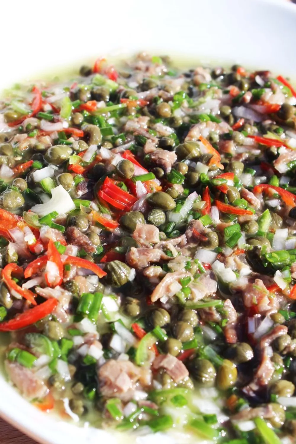 Meng de pepertjes met de ansjovis, kappertjes, bieslook, sjalot, limoensap en olijfolie. Schep bovenop de mozzarella en serveer met krokant gegrild brood.