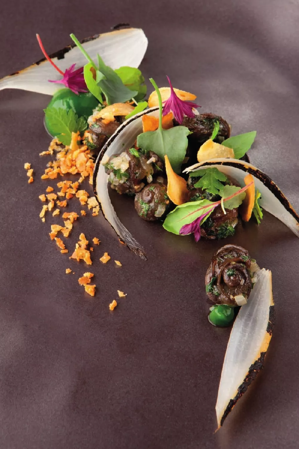 Deze verfijnde Naamse slakken met een zijdezachte puree van groene kruiden en knapperige knoflookchips verenigen klassieke Franse flair met een frisse, moderne toets. Gebakken escargots worden opgewerkt met boter, citroen en peterselie, de kruidenpuree wordt geblancheerd en gepureerd met gevogeltebouillon en hazelnootboter, en de gefrituurde knoflook en gebrande zoetzure uien geven smaak en textuurcontrast. Perfect als feestelijk voorgerecht of hoofdgerecht in lente en herfst, ideaal met roggebrood en gezouten boter.