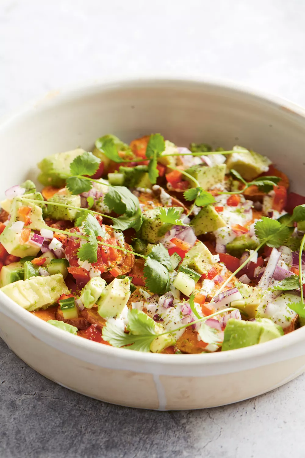 Deze kleurrijke nachos van zoete aardappel met frisse avocadosalsa en romige macadamiaroom zijn een feestelijk, plantaardig borrelhapje of lichte maaltijd. Krokant geroosterde schijfjes uit de oven combineren zoete tonen met limoenzest, terwijl koriander, komkommer en limoensap voor een verfrissend contrast zorgen en de blender de notenroom zijdezacht maakt. Perfect voor zomerse picknicks, informele diners of als gezonde snack, eenvoudig pittig te maken met extra chili of cayenne.