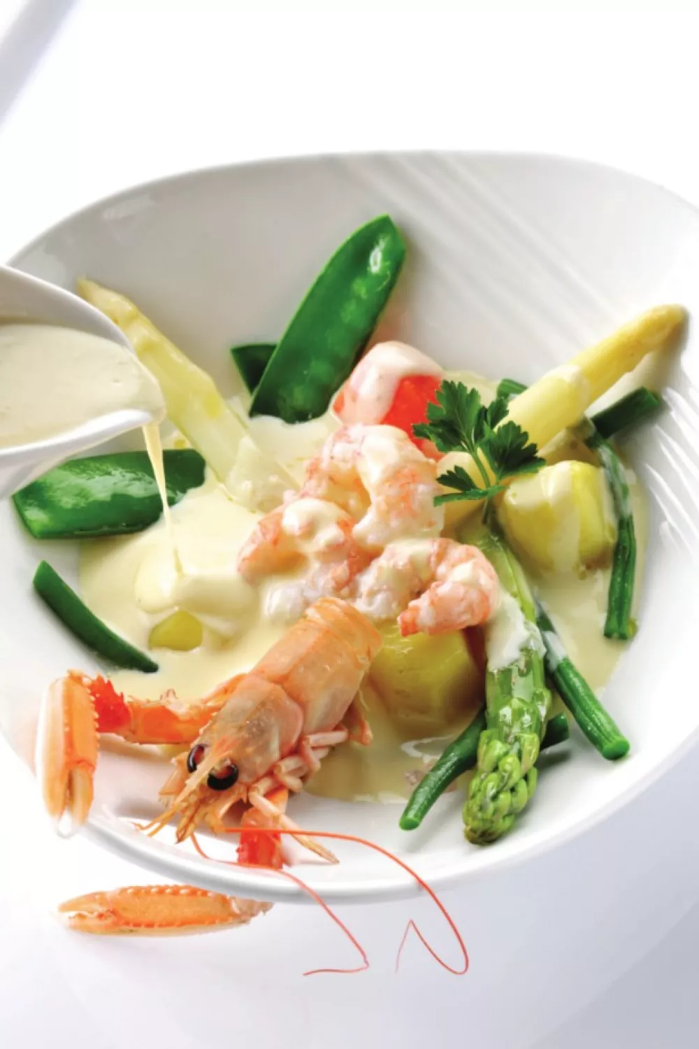 Deze Nieuwpoortse waterzooi met kraakverse langoustines en lentegroenten is een romige, subtiele klassieker die zich prima leent voor een feestelijk voorjaarsdiner. De delicate kreeftensmaak van de langoustines ontmoet tuinboontjes, sluimererwten, witte en groene asperges en zachte aardappeltonnetjes in een fluwelige roombouillon. De bereiding is licht en verfijnd, met groenten beetgaar koken, schaaldieren heel kort pocheren en de saus afwerken met room en eierdooiers.