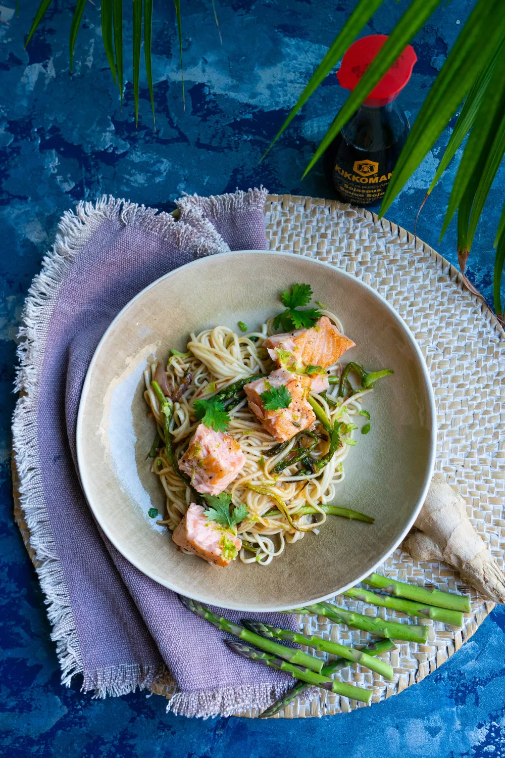 Lichte udon noedels met knapperige groene asperges en sappige gebakken zalm vormen een smaakvolle Aziatisch geïnspireerde maaltijd die snel op tafel staat. Gember, sojasaus en zoete chilisaus zorgen voor pittige diepgang, terwijl limoen, koriander en sesamolie frisse tonen toevoegen. Perfect als doordeweeks diner of als feestelijke lente en zomerse optie wanneer je iets snel en verfijnd wilt serveren.