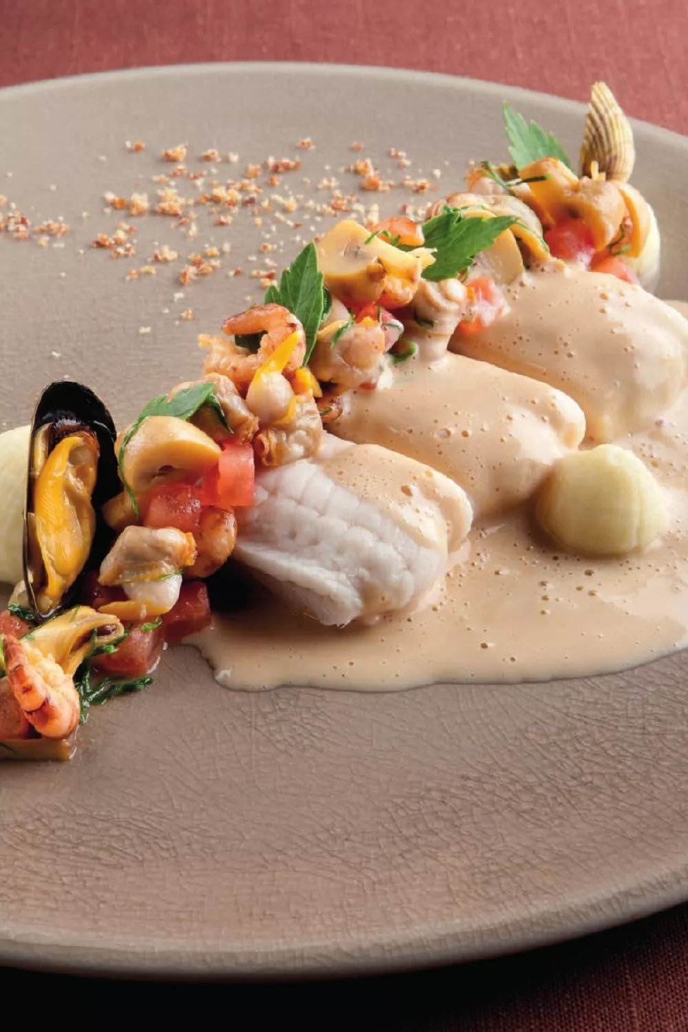 Zacht gegaarde Noordzeetong met een rijke mengeling van mosselen, kokkels en garnalen in een romige wittewijnsaus zorgt voor een verfijnd en zeezoutig visgerecht. De tong gaart rustig in de oven, het schelpdierenbouillon wordt ingekookt met garnaalkoppen, lavas en laurier tot een fluweelachtige saus en de ratte aardappelpuree met gebakken champignons en citroen geeft comfort en frisheid. Perfect als feestelijk hoofdgerecht in lente of zomer.