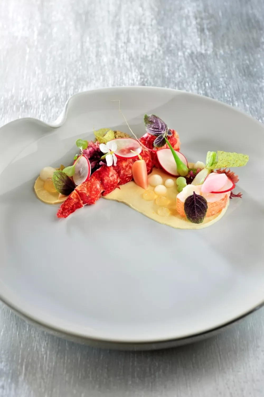 Verdeel de crème over de borden, leg er een mooi stuk kreeft op en werk af met de radijzen, algen, crunch en eventueel wat bloemetjes, slangenradijs, Oost-Indische kers, ...