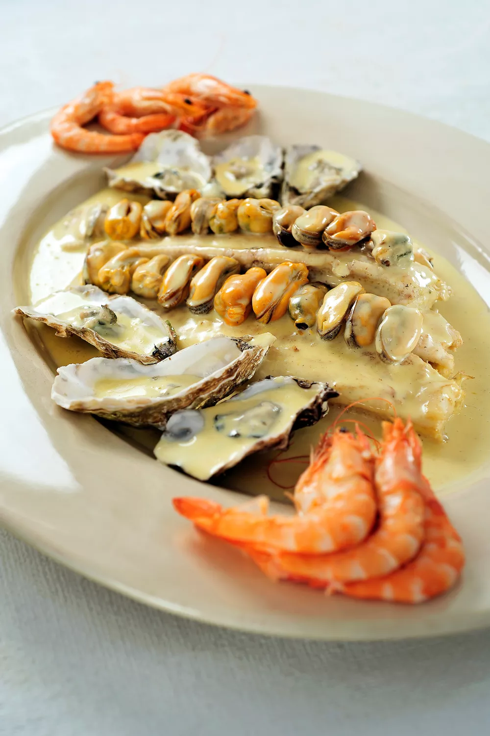 Deze Normandische zeetong combineert zachte visfilets met een romige wittewijnsaus en een rijk palet aan zeevruchten zoals langoustines, oesters en mosselen. De tong wordt zachtjes gesudderd in boter en bouillon en afgewerkt in de oven, terwijl de schelpdieren kort in de saus worden gepocheerd en gebonden met room en eidooiers. Een elegant klassiek gerecht, perfect voor een feestelijk visdiner of een zomerse avond aan zee.