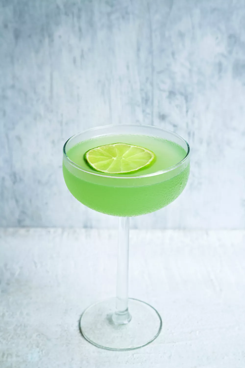 De Nuclear Daiquiri is een krachtige, groengekleurde twist op de klassieke daiquiri met overproof rum en Chartreuse verte die kruidige en plantaardige tonen toevoegt. Met vers limoensap en zoete falernum krijgt de cocktail een frisse, licht tropische balans en wordt hij kort en intens geschud op ijs voor een ijskoude, fluweelachtige textuur. Perfect als opvallend aperitief of borreldrank, geserveerd in een coupe en gegarneerd met een limoenwieltje.