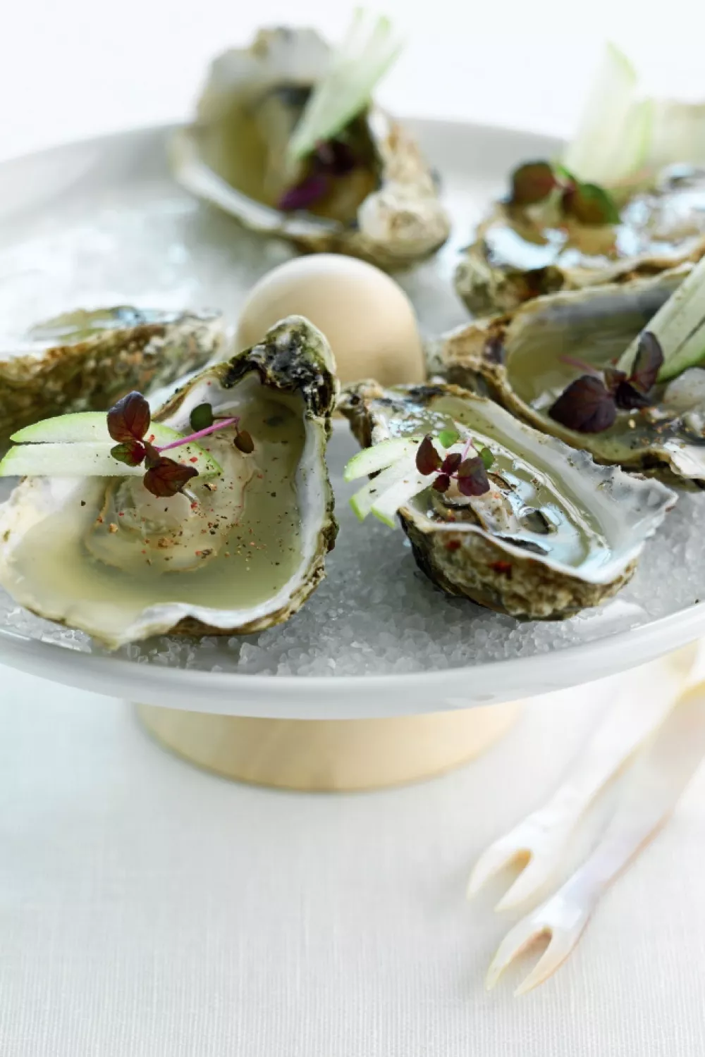Schik de oesters terug in de schelp. Lepel er de gelei over en laat opstijven in de koeling. Haal de oesters net voor het serveren uit de koeling en werk af met de staafjes appel, roze peperkorrels en blaadjes shiso.