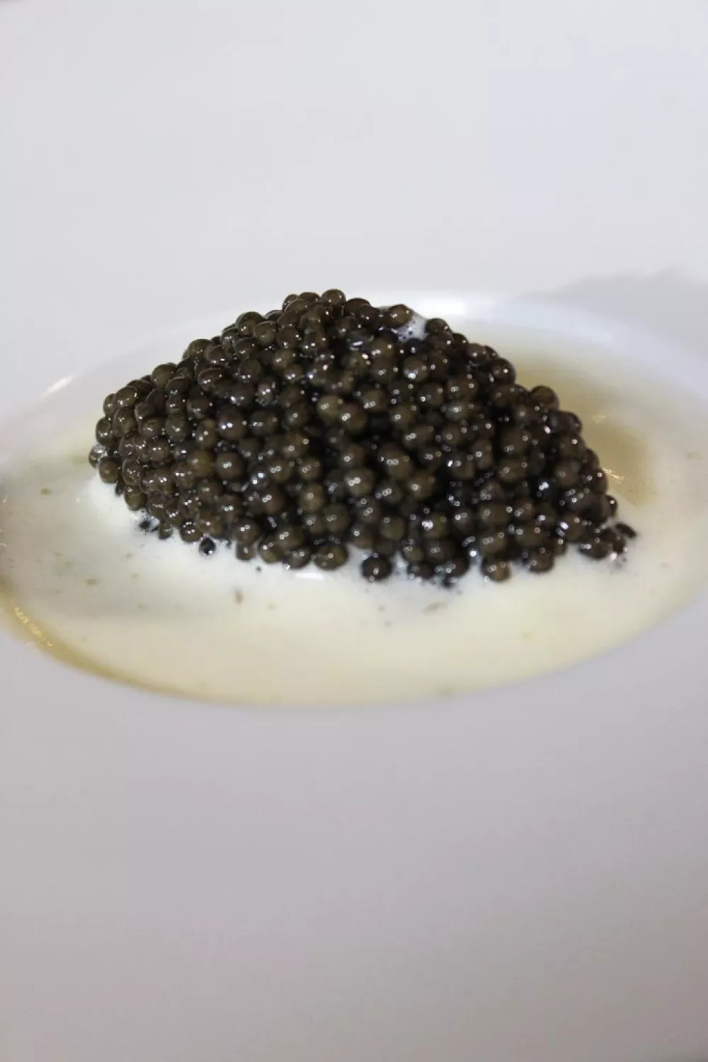 Dresseer een lepeltje van de tapioca in een diep bord. Leg hierop een oester en een lepeltje kaviaar. Overgiet met de sabayon.