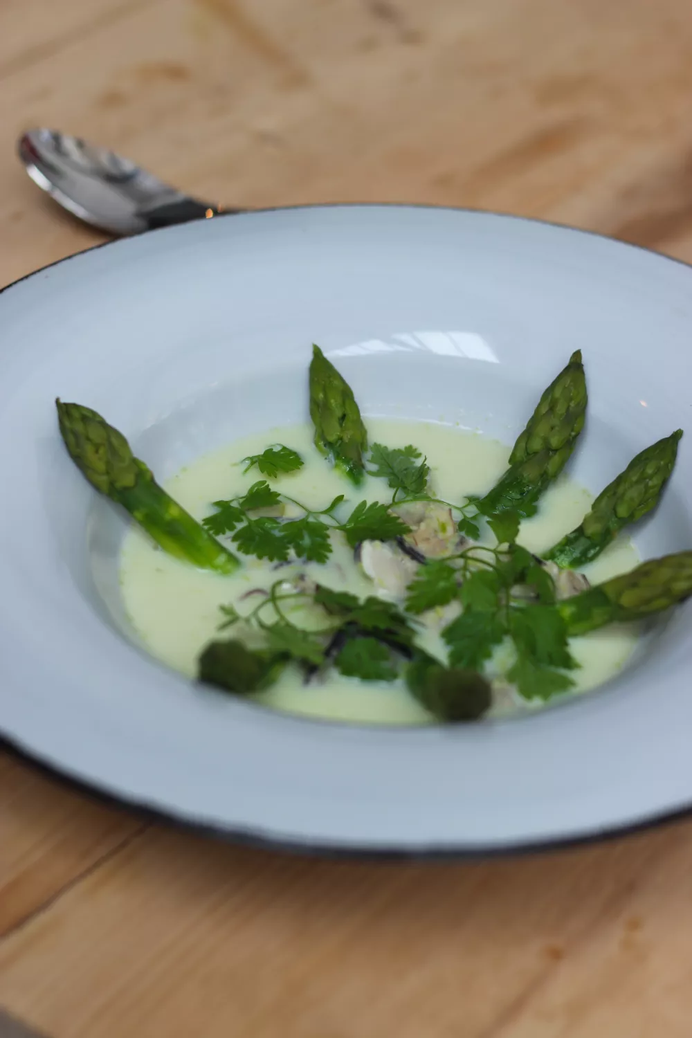 Een romige oestersoep met groene asperges en frisse kervel, waarin zilte oesters en een scheutje citroen voor een verfijnde smaak zorgen. De soep wordt gebonden met een klassieke liaison van eidooiers en room en krijgt zijn zijdezachte textuur door het pureren van asperges en het toevoegen van oestersap. Perfect als elegant voorgerecht tijdens een lente etentje of bij een feestelijk diner.