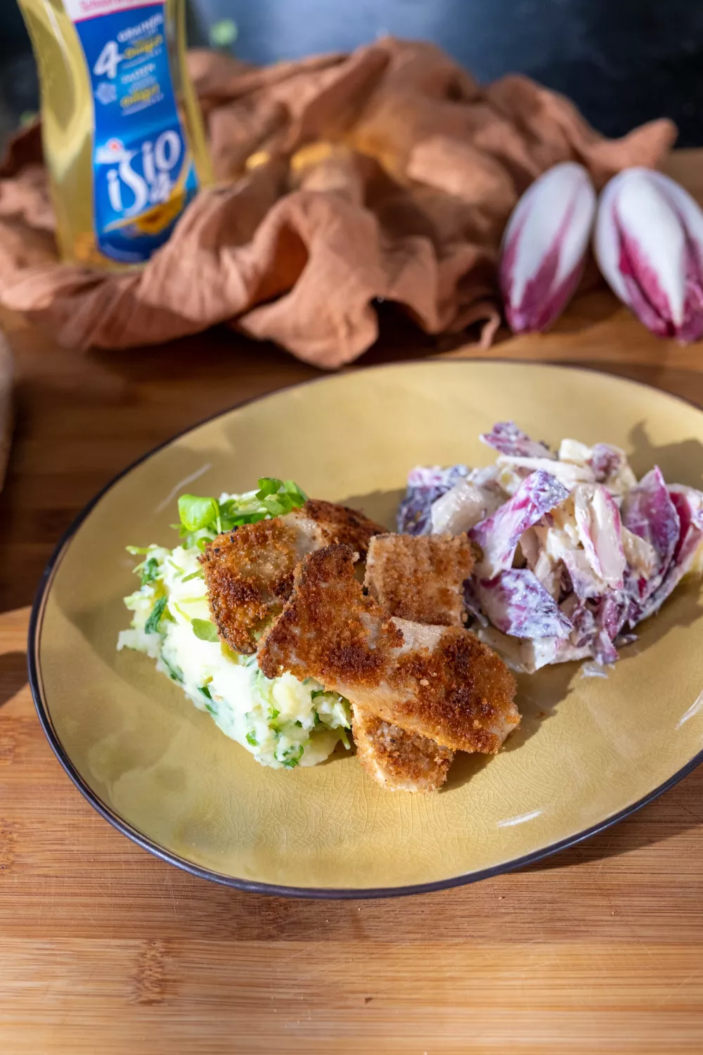 Oesterzwamnuggets met roodloofsalade en waterkersstoemp