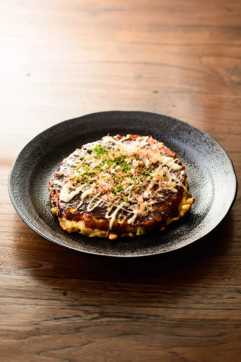 Okonomiyaki is een luchtige Japanse hartige pannenkoek boordevol spitskool, geraspte yamaimo en umamirijke dashibouillon, afgebakken onder krokant buikspek. Bereid op een hete teppanyaki of in een pannenkoekenpan ontstaat een knapperige buitenkant en zachte binnenkant, met tenkasu voor extra textuur. Werk af met okonomiyakisaus, mayonaise, aonori en katsuobushi en serveer deze comfortfood klassieker bij lunch, diner of op koude herfst en winteravonden.