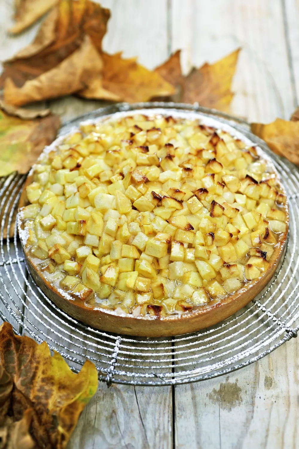 Een klassieke oma's appel- en perentaart met knapperig boterdeeg en een zachte vulling van Jonagold-appels en Doyenné-peren. De amandelbestrooide bodem wordt gevuld met blokjes fruit in een romige boter-suiker-eidooiercrème, subtiel op smaak gebracht met citroen- en sinaasappelzeste en in de oven goudgeel gebakken. Afgewerkt met een glanzend laagje abrikozengelei en poedersuiker is dit herfstige ovengebak perfect bij de koffie, als brunchtaart of voor een gezellige familiebijeenkomst.