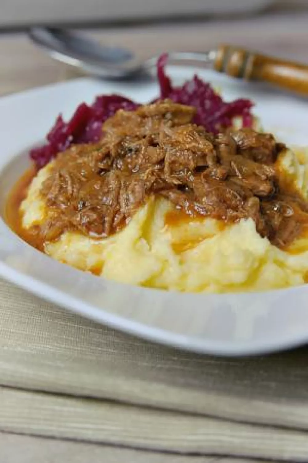 Lekker met aardappelpuree en rode kool met appeltjes.