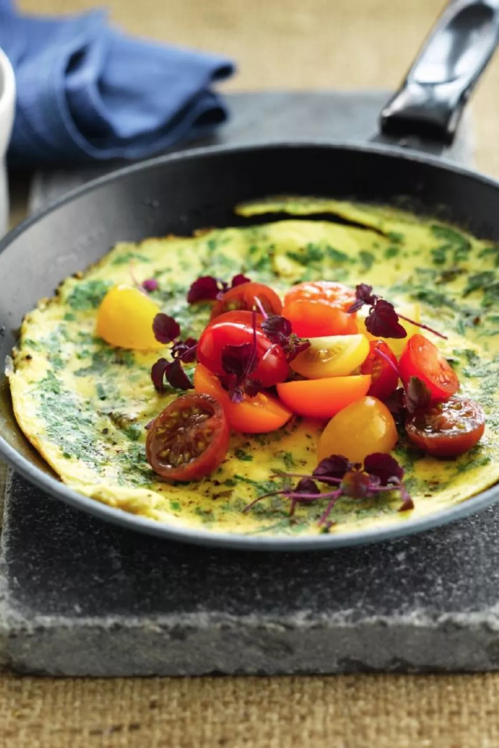 Een luchtige omelet van losgeklopte eieren en romige kruidenkaas, verrijkt met dille, munt en peterselie en afgemaakt met zoete kerstomaatjes en pittige cress. Dit snelle panrecept bak je in enkele minuten, ideaal voor een hartig ontbijt, lichte lunch of zomerse brunch. Serveer met warm meergranenbrood voor extra bite en een voedzame start van de dag.