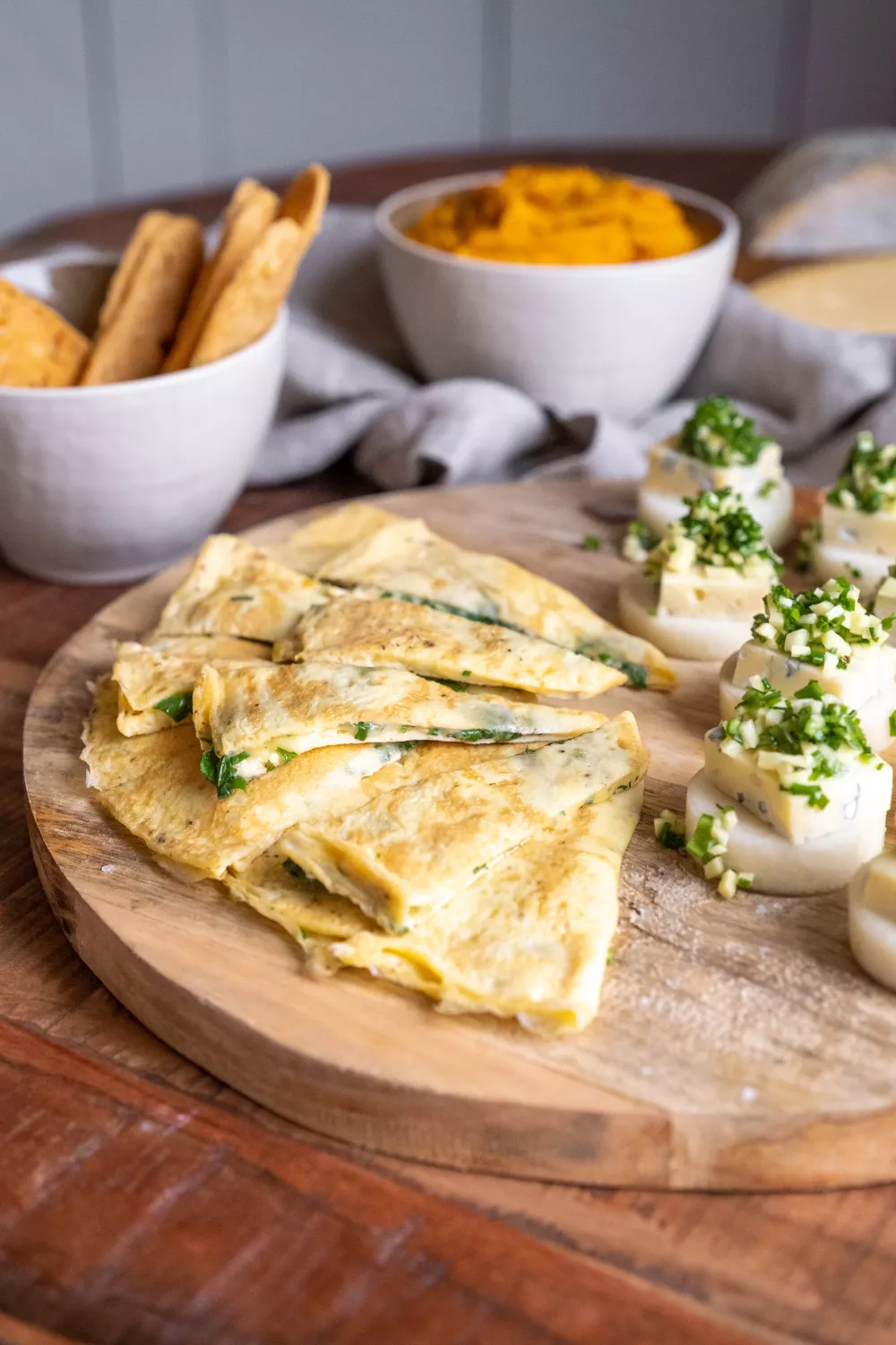 Snijd de omeletjes in kleine driehoekjes alvorens te serveren.