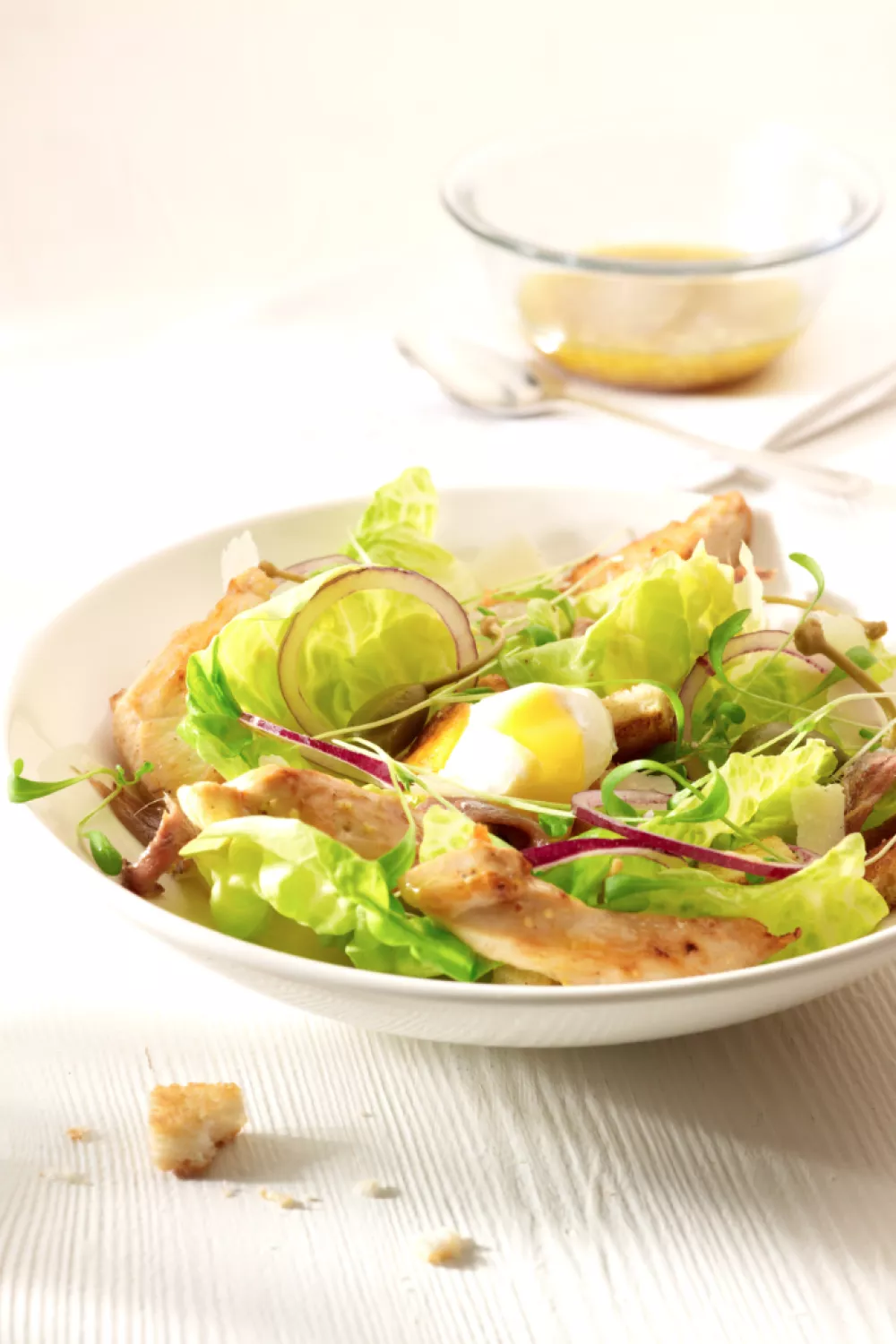 Frisse Caesar salade met krokante croutons, goudbruin gebakken kipblokjes en zacht gepocheerde kwarteleitjes die een perfecte mix van hartig en romig bieden. De rijke dressing met notenolie, ansjovis en een subtiele gelering van gelatine zorgt voor een zijdezachte textuur, terwijl kappertjes, rode ui en geraspte Parmezaan voor extra zoutige tonen zorgen. Perfect als lichte lunch of feestelijk hoofdgerecht in de warmere maanden, bereid met pocheren en snel bakken voor maximale smaak.