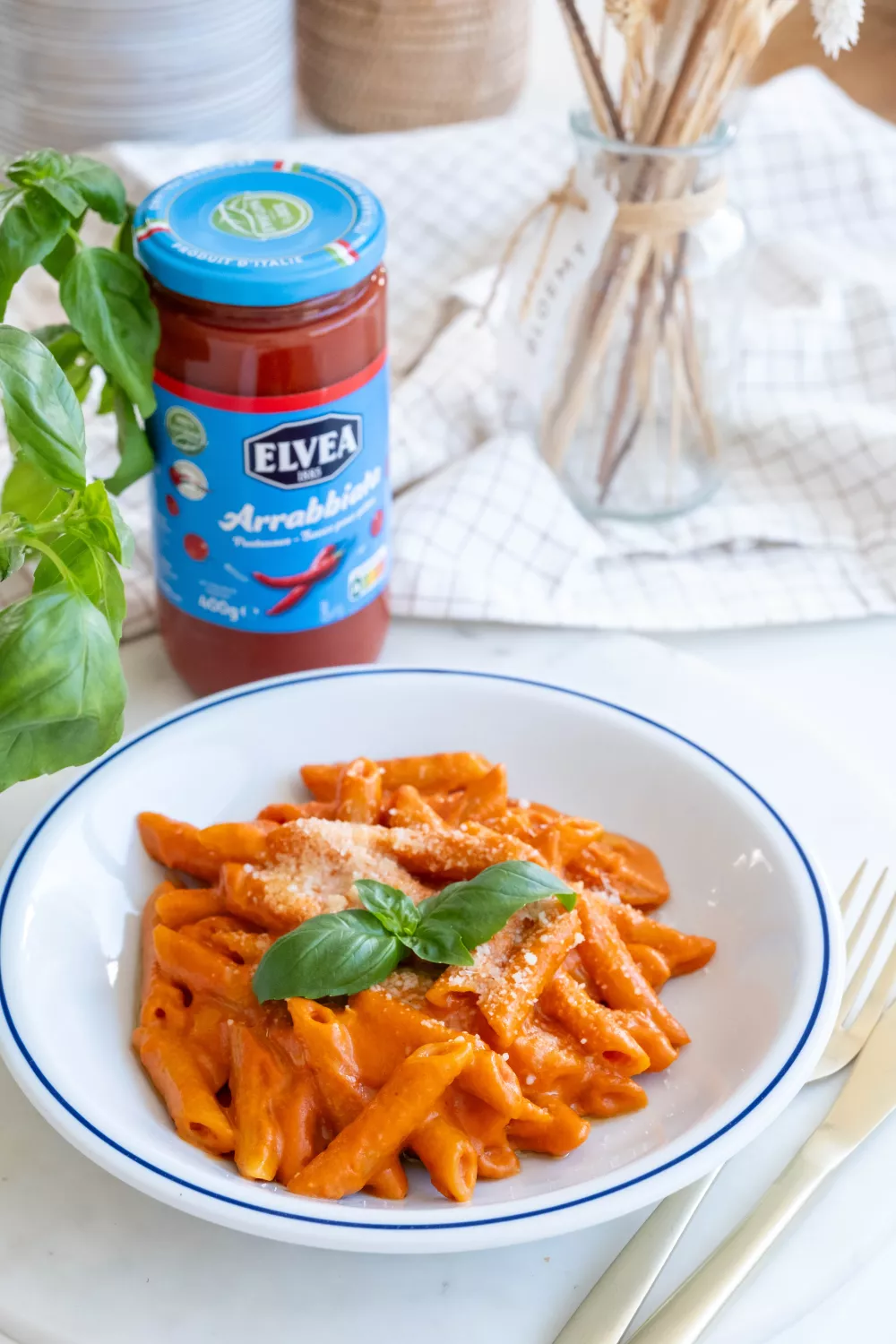 Romige penne alla vodka uit één pan, met pittige arrabbiata, room en een scheut vodka voor extra diepte. De pasta gaart in 25 tot 30 minuten in de saus zodat alle smaken goed intrekken. Perfect als snelle doordeweekse maaltijd of gezellige troostmaaltijd, afgewerkt met Parmezaanse kaas en zwarte peper.