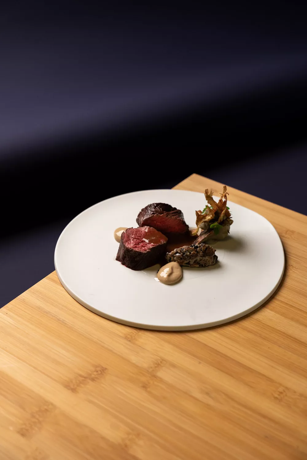 Onglet met artisjok, shiitake en zwarte look combineert sappig rood vlees met aardse paddenstoelen en diepe umami. Het vlees wordt vacuüm gegaard op 58 graden voor een boterzachte textuur, de saus wordt gereduceerd met rode wijn en port en afgewerkt met boter. Romige artisjokcrème, krokante artisjokchips en aromatische zwarte lookolie maken dit ideaal voor een feestelijk diner of een herfstige avond.