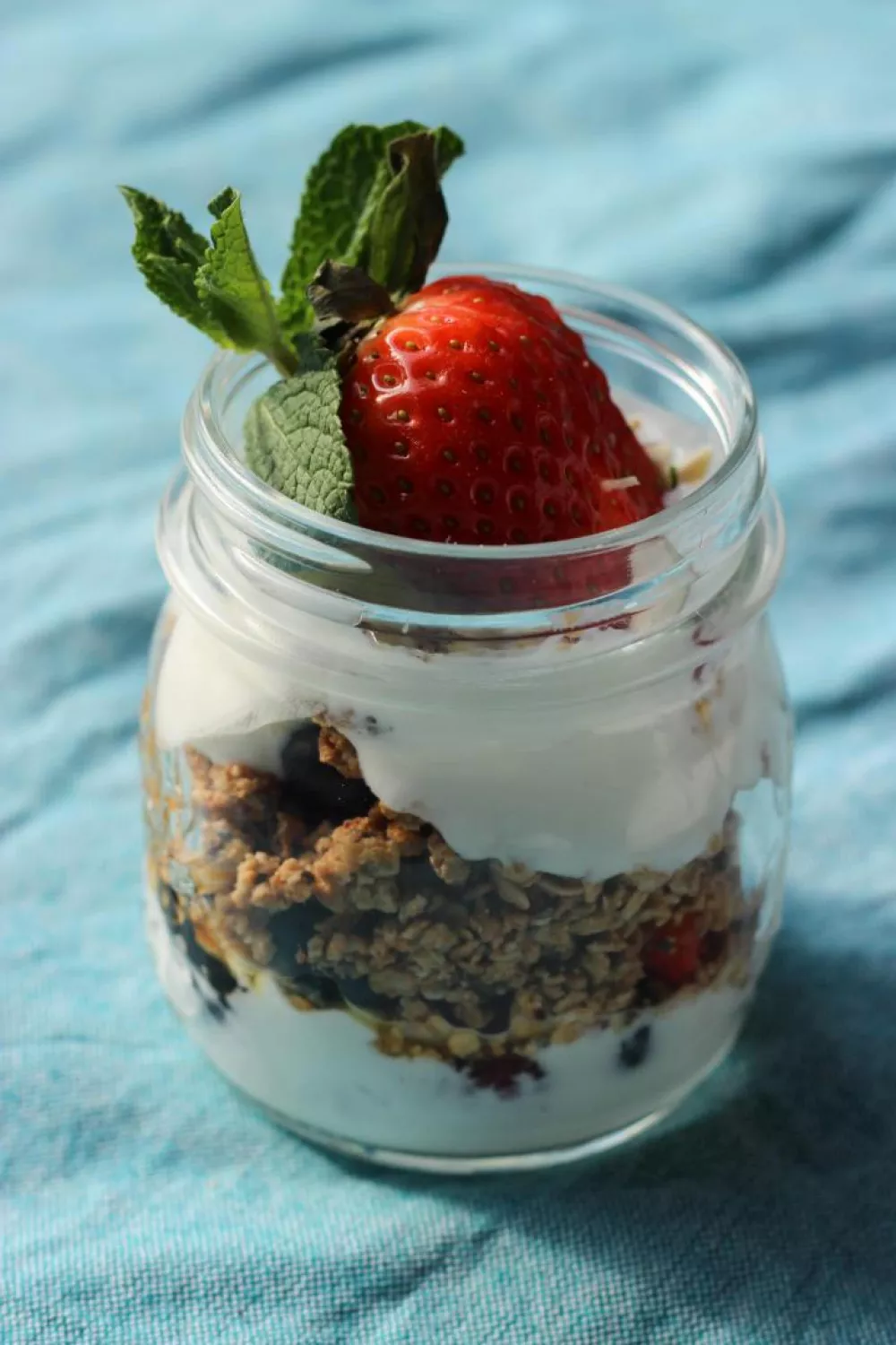 Neem een glazen bokaaltje en schep hierin twee flinke eetlepels Griekse yoghurt. Sprenkel er wat maple syrup over en beleg met rode vruchtjes. Herhaal deze stappen nog een keertje en vul de bokaal vervolgens op met granola. Bestrooi nog met enkele fijngehakte amandelen en werk af met een aardbeitje en een takje munt.