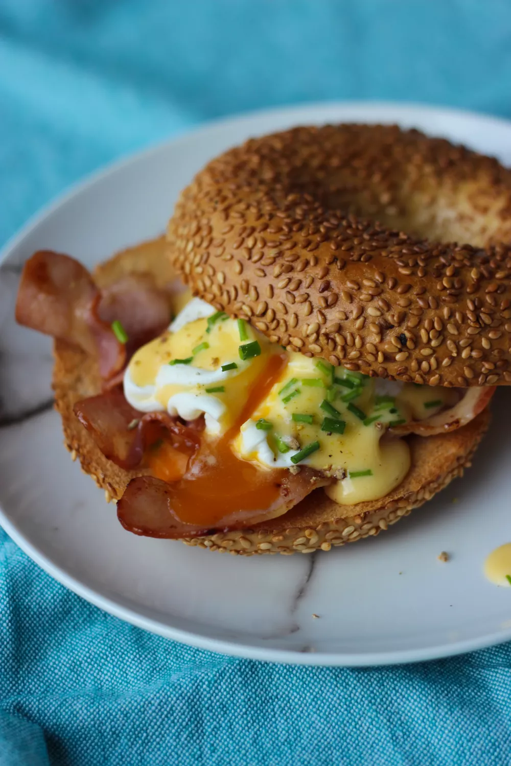 Een smeuïge ontbijtbagel met alle charme van Eggs Benedict: zacht gepocheerd ei, krokant ontbijtspek en een fluweelachtige hollandaisesaus op geroosterde bagelhelften. De saus maak je door eidooiers, witte wijn en citroensap zacht te emulgeren en al kloppend boter toe te voegen, de eieren pocheer je kort in azijnwater. Perfect voor een feestelijk weekendontbijt of een chique brunch.