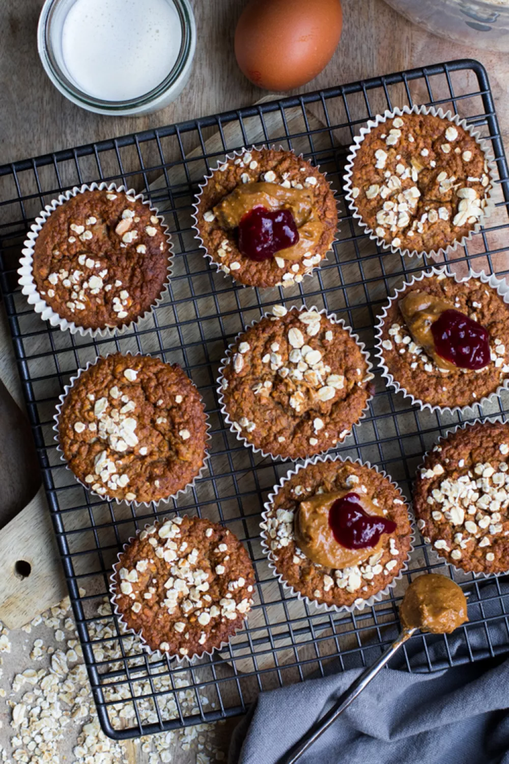 Schep het beslag in de bakvormpjes. Strooi wat havermout op de muffins en bak ze in 30 minuten gaar in de oven.