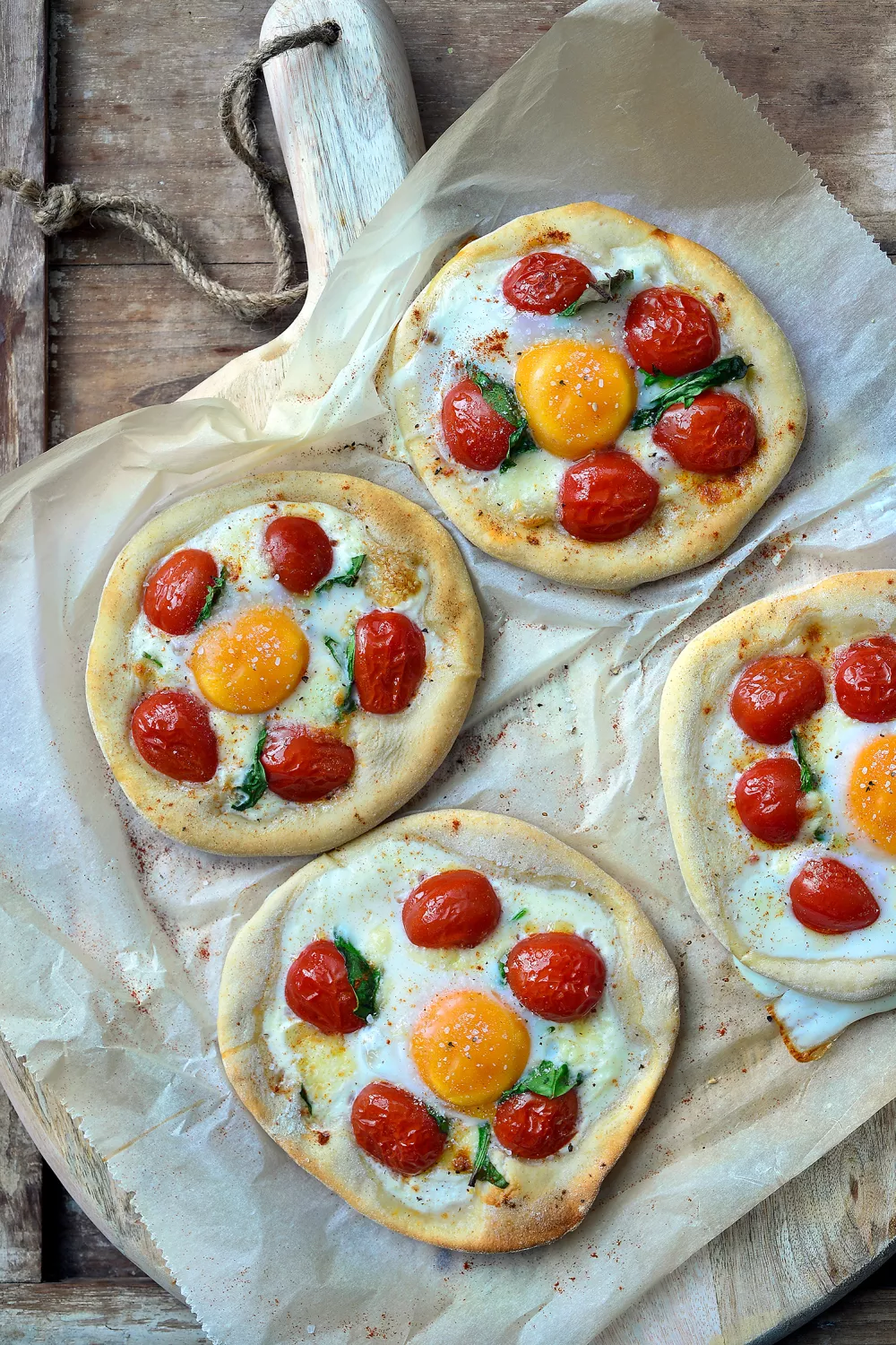 Maak het pizzadeeg volgens het basisrecepten vorm er vier kleine pizza’s van. Beleg de pizzabodems met de kerstomaatjes, de mozzarella en de spinazie. Bestrooi met een snuifje smoked sweet paprikapoeder.
