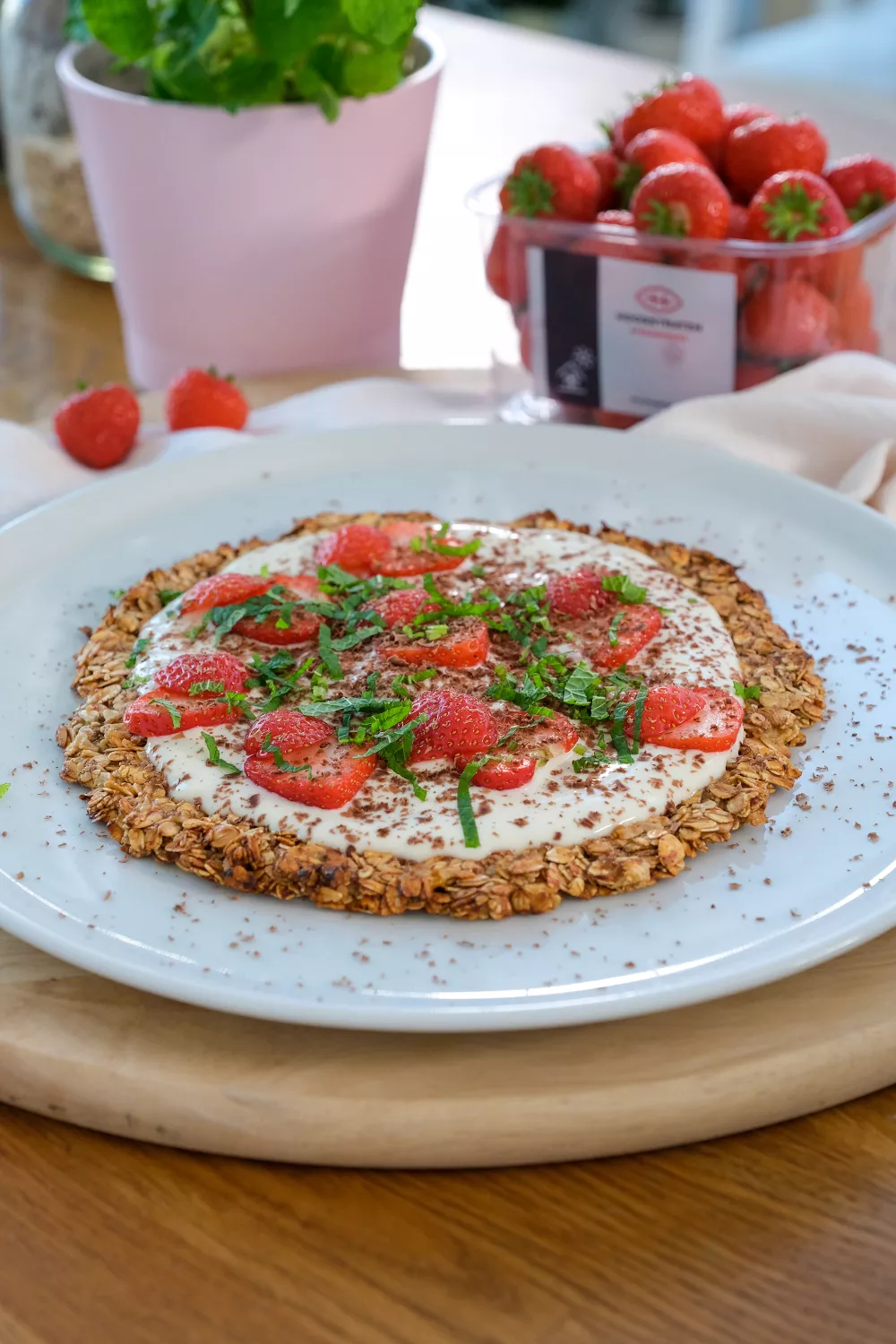 Een frisse ontbijtpizza met een knapperige havermoutbodem, romige yoghurt en een topping van zoete aardbeien, munt en chocolade. De basis van banaan, havervlokken, honing en kaneel bak je kort in de oven tot goudbruin zodat er een stevige, lichte bodem ontstaat. Makkelijk en voedzaam, perfect voor lente- of zomerochtenden als snel ontbijt of vrolijke brunch.