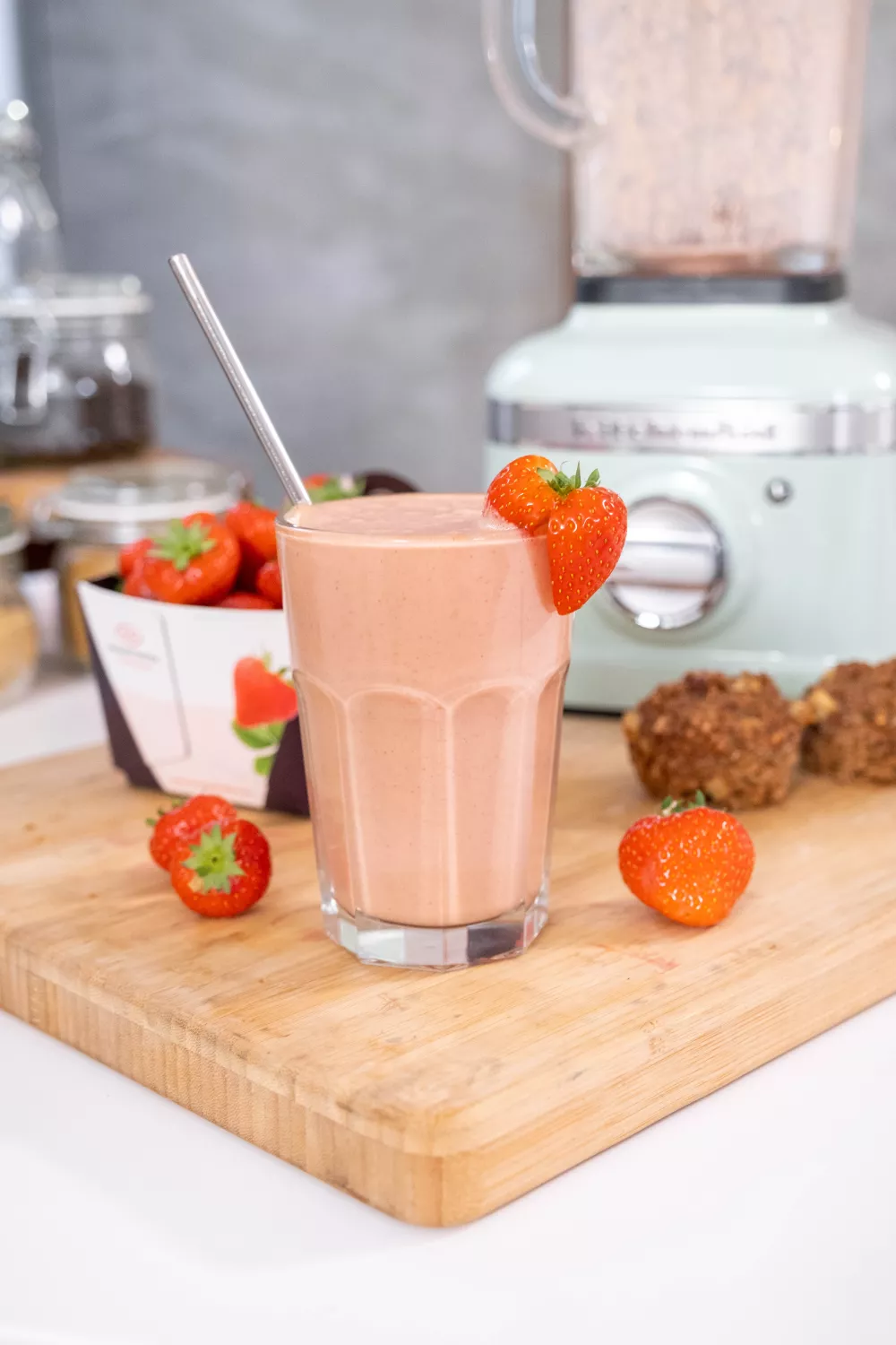 Mix tot je een gladde smoothie bekomt en schenk uit in glazen. Werk de glazen af met een aardbei en herbruikbaar rietje.