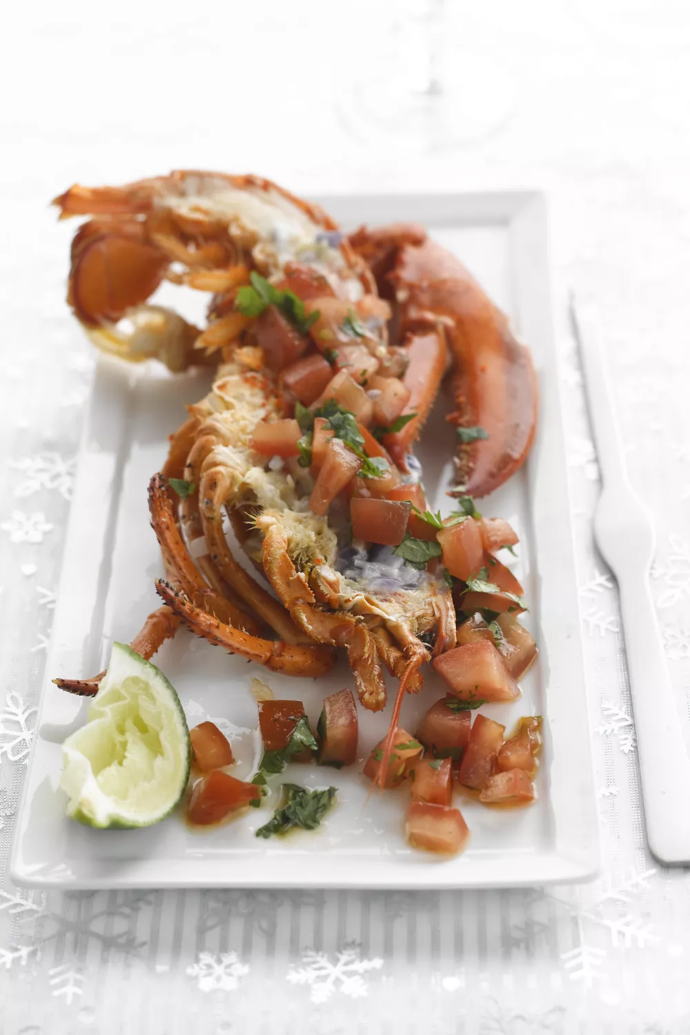 Schik een halve kreeft op een bord. Schep op het staartgedeeelte de stukjes tomaat. Werk af met limoenpartje, serveer met stukje brood.