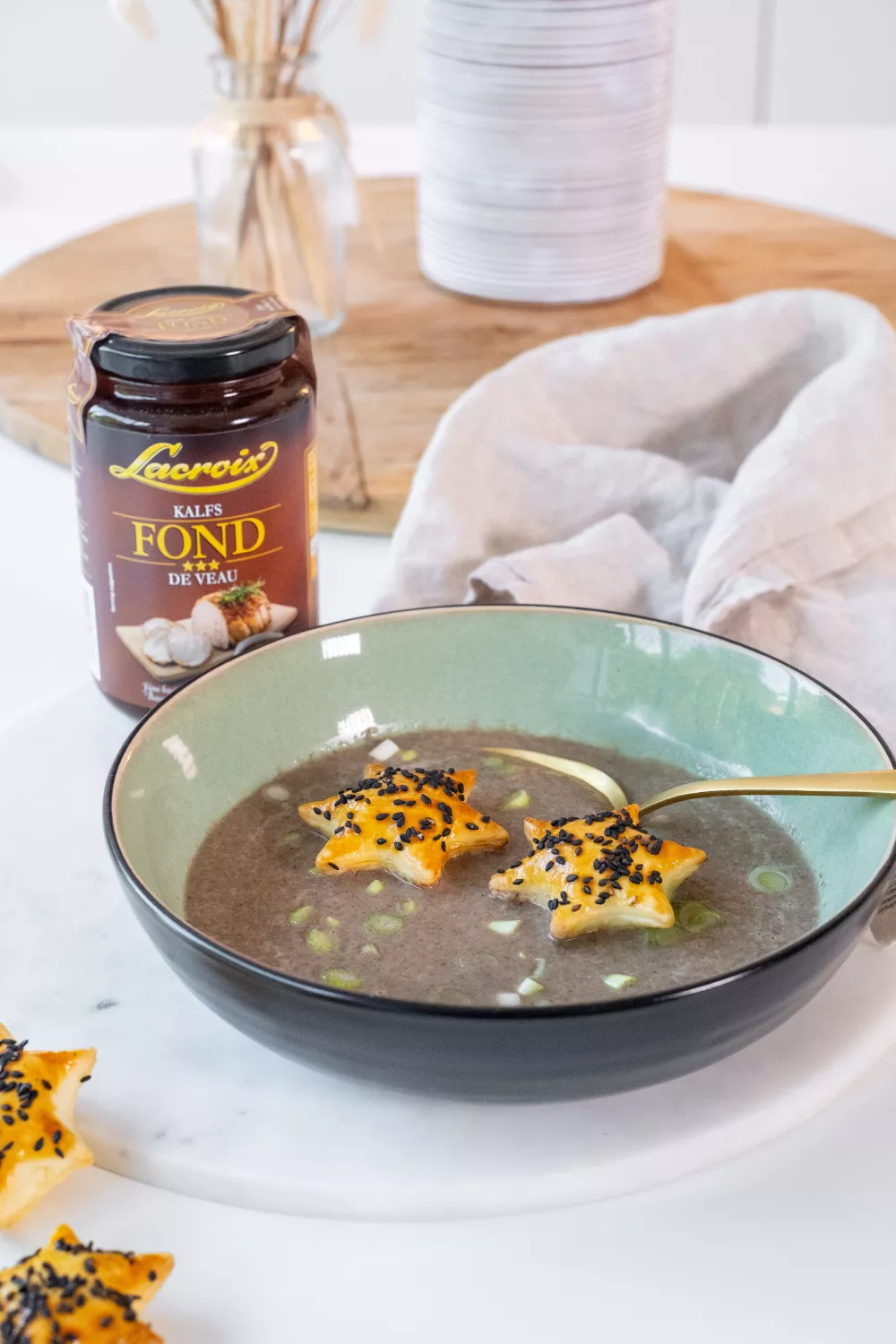 Laat je verleiden door deze Oosterse champignonsoep met sesamsterren, boordevol smaak en romigheid dankzij de Lacroix kalfsfond en kokosmelk. De gember, look en sojasaus geven de soep een heerlijke Aziatische toets, terwijl de krokante bladerdeegsterren met sesam een feestelijke afwerking vormen. Perfect als verfijnd voorgerecht of hartverwarmende maaltijdsoep!
