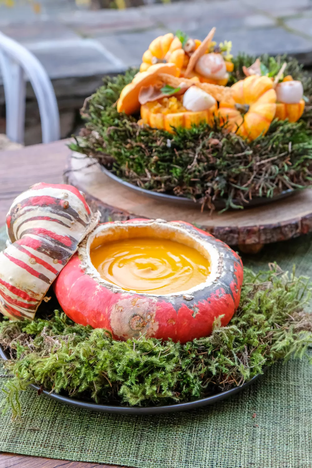 Romige oosterse pompoensoep met galanga en citroengras brengt warme herfstsmaken samen met de zoete diepte van pompoen en een umamiaccent van ketjap manis. Stoof uien en pompoen, laat de aromaten meekoken en pureer tot een fluweelzachte soep voor een rijke textuur. Met room en hazelnoten is dit comfort food perfect voor koude avonden of als feestelijk voorgerecht.