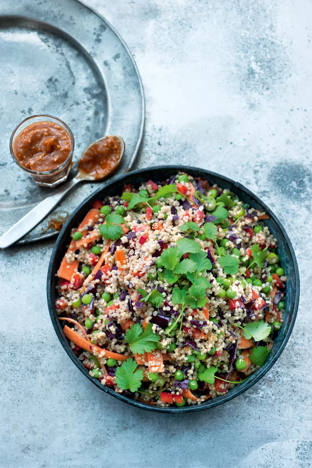 Deze frisse oosterse quinoasalade combineert luchtige quinoa met knapperige wortelslierten, rode kool, zoete puntpaprika en groene erwtjes tot een kleurrijk en voedzaam gerecht. Een romige pindabotersaus met sojasaus, ahornsiroop, verse gember en een snufje chili zorgt voor zoetzure en pittige smaakaccenten. Snel te maken door quinoa te koken, erwtjes kort te blancheren en groenten dun te schaven met een dunschiller, ideaal als zomerse lunch, vegetarische maaltijd of voor mealprep.
