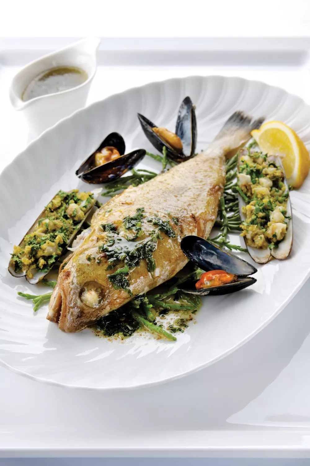 Knapperig op de graat gebakken steenbolk met boter en bloem vormt de smaakvolle basis van dit zomerse zeevruchtengerecht. De vis wordt geserveerd met gestoomde mosselen en met peterselie en broodkruim gevulde scheermessen, afgewerkt met citroen, knoflook en zeekraal uit zee. Perfect voor een elegant diner aan zee of een feestelijke maaltijd waarop paneren, bakken en stomen samenkomen.