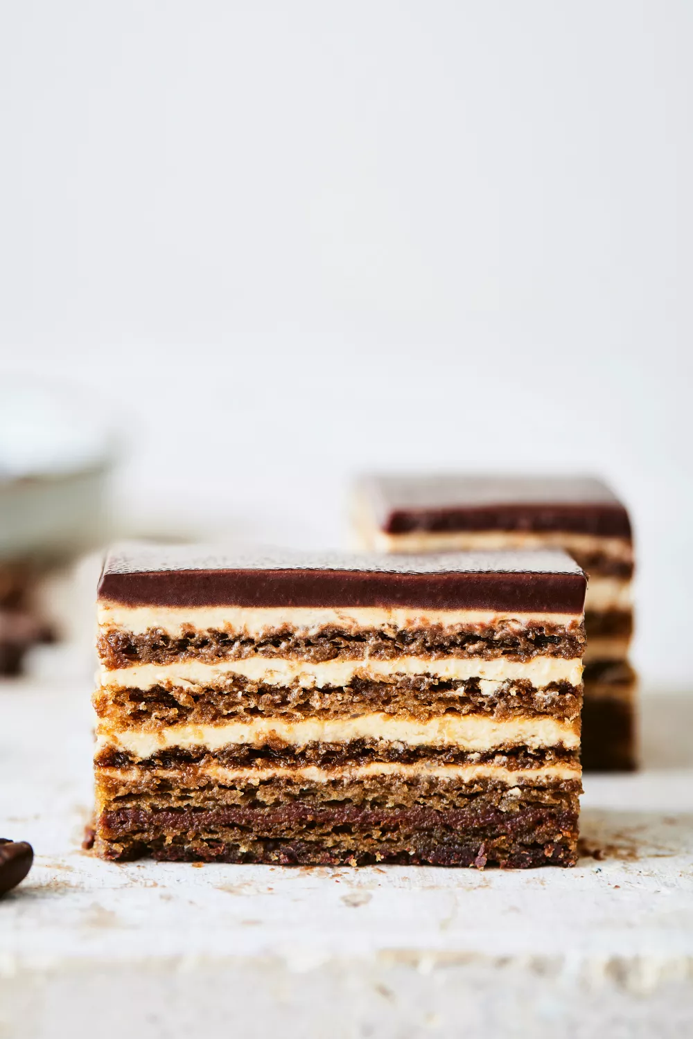 Deze klassieke opera is een verfijnd, gelaagd gebak met intense koffie, fijn amandelbiscuit, romige botercrème en glanzende chocoladeganache. De smaak balanceert uitgesproken koffie en pure chocolade met zachte boter en banketbakkersroom, ideaal als feestelijk dessert of bij een smaakvolle koffiepauze. Met basistechnieken uit de patisserie zoals luchtig biscuit bakken, banketbakkersroom koken en lagen opbouwen maak je een indrukwekkend resultaat.
