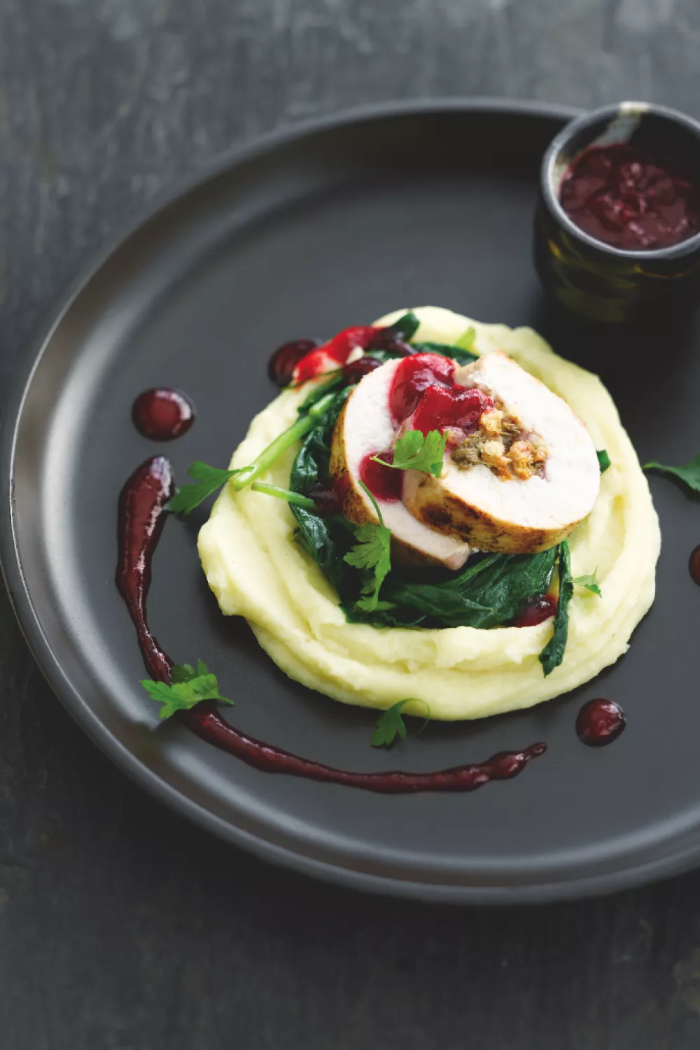 Serveer stukjes kalkoen met aardappelpuree, spinazie en veenbessensaus.