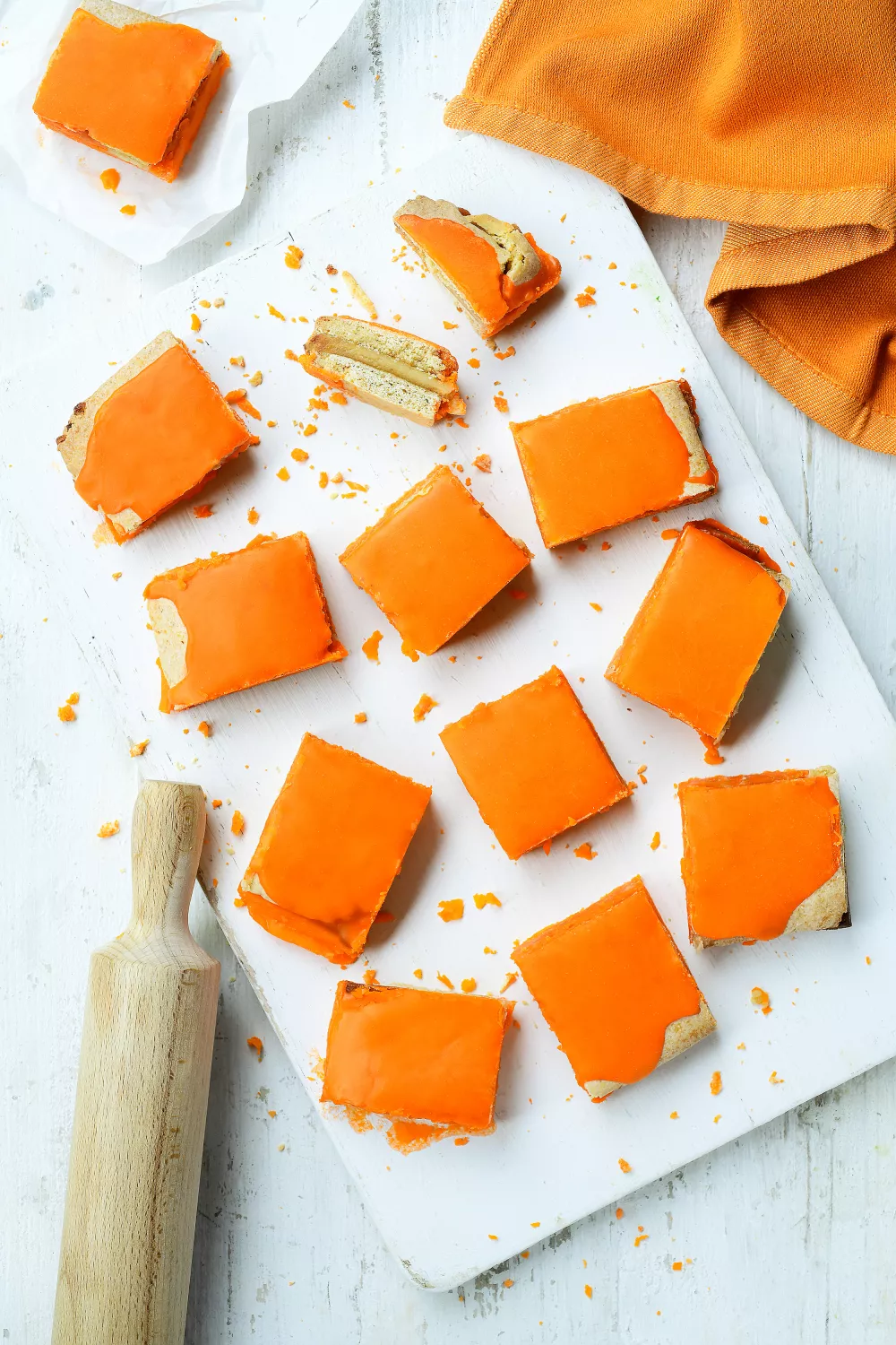 Deze oranje koek combineert smeuïge marsepein, basterdsuiker en warme specerijen zoals kaneel en nootmuskaat met frisse sinaasappelzeste voor een feestelijke, huiselijke smaak. Het deeg wordt simpel gekneed, gekoeld en tot drie lagen opgebouwd rondom de marsepein, waarna de koek goudbruin gebakken en afgewerkt wordt met een glanzend oranje glazuur. Lekker bij de koffie tijdens winterse feestdagen of als kleurrijke traktatie bij verjaardagen en borrels.