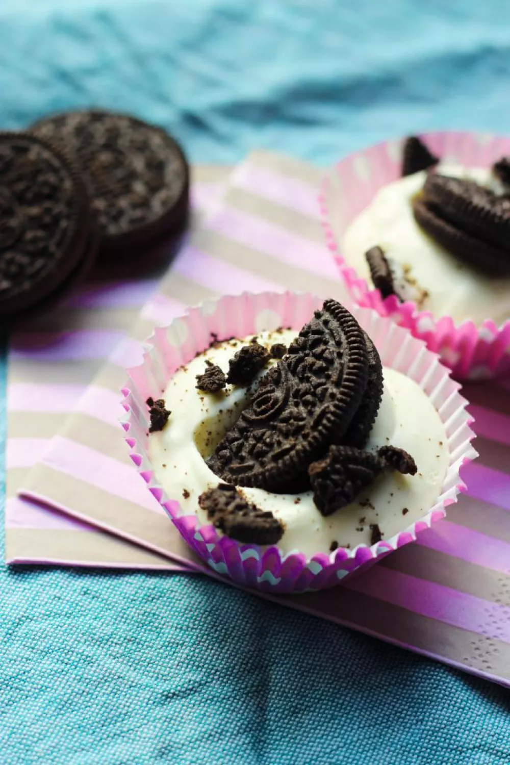 Neem opnieuw de cupcakevorm en verdeel het roomkaasmengsel nu over de verschillende vormpjes. Neem enkele oreo’s en snijd ze in twee. Versier elk cheesecakevormpje nu met een half koekje.