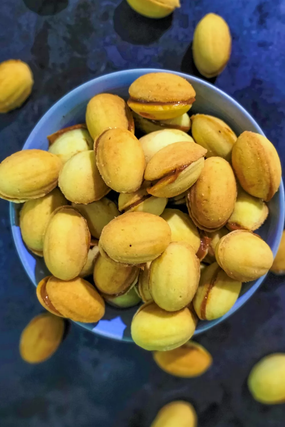 Knapperige oreshki koekjes gevuld met zelfgemaakte dulce de leche en fijngehakte walnoten brengen nostalgische, feestelijke warmte aan je koffietafel. De karamelachtige vulling maak je door een blik gecondenseerde melk enkele uren te garen en te mengen met walnoten, terwijl het zachte zanddeeg van bloem, boter, poedersuiker, ei en vanille in een oreshkivorm goudbruin wordt gebakken. Perfect bij de thee of als winterse traktatie voor gezellige momenten.