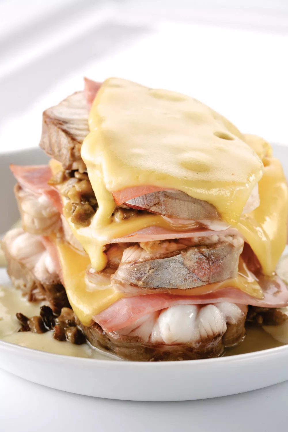 Orloff stijl hondshaai met oude kaas, gekookte ham en champignons is een hartig visgerecht dat ideaal is voor een gezellige winterse avond of een feestelijk diner. Krokant gebakken medaillons worden gelaagd met fijne paddenstoelen en ham, overgoten met romige bechamelsaus en afgebakken onder de grill tot de kaas goudbruin en gesmolten is. Serveer dit verwarmende, smaakvolle hoofdgerecht met een volle witte wijn of robuuste rode wijn.