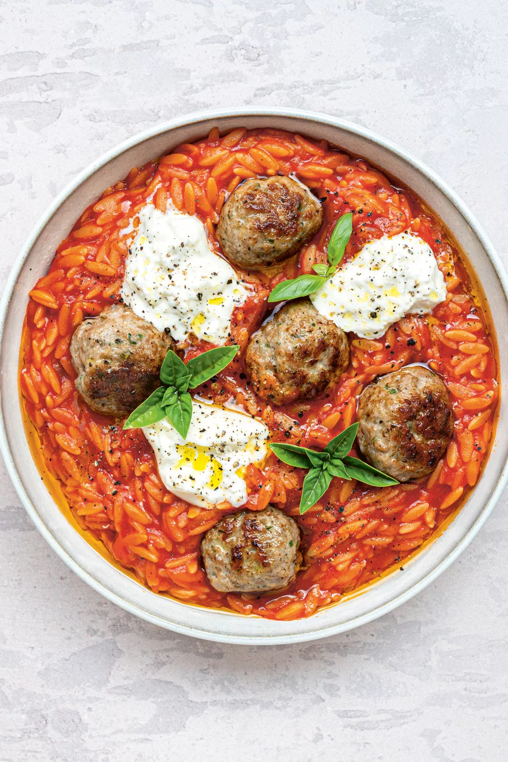 Dien de orzo met de Italiaanse balletjes op in diepe borden en werk elk bord af met burrata, enkele blaadjes basilicum, een royale scheut olijfolie en een draai van de pepermolen.