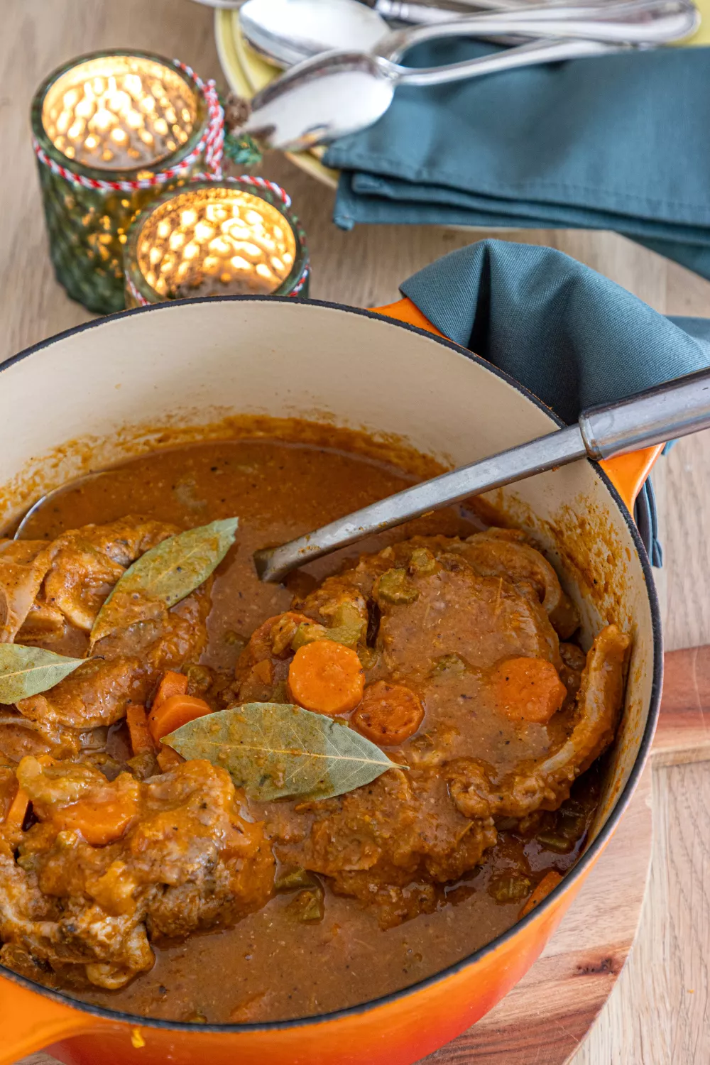Leg na enkele minuten de gebruinde schenkels en het braadsap op de groenten en voeg de witte wijn, tomatensaus en laurier toe. Laat alles 1,5 uur pruttelen op een zacht vuur. Kook de spaghetti volgens de instructies op de verpakking. Serveer de ossobuco met de spaghetti en werk af met peterselie, peper en zout.