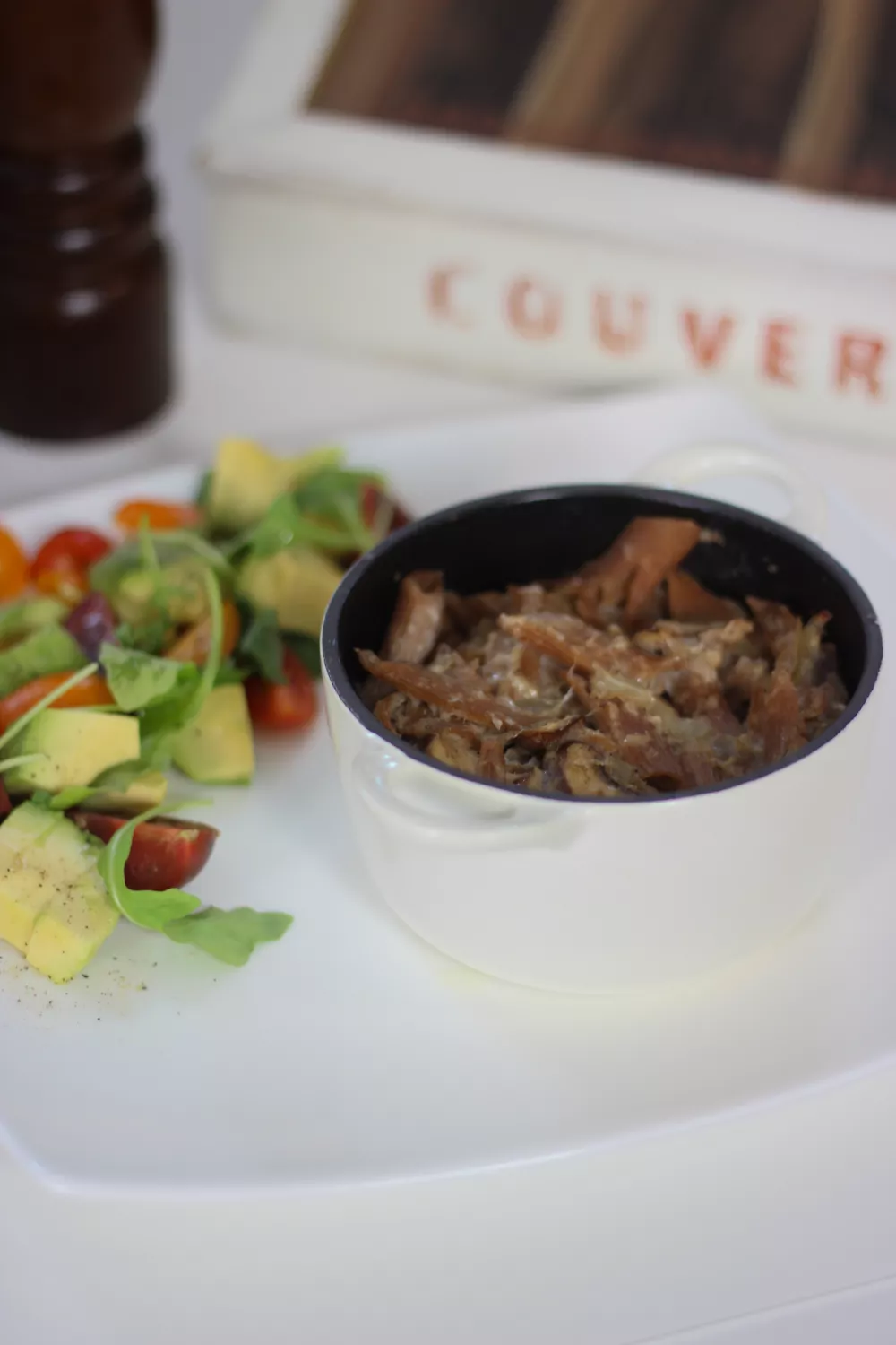 Maak ondertussen het slaatje klaar. Snijd de avocado in blokjes en besprenkel met limoensap. Snijd de kerstomaatjes in vieren. Meng de rucola met de avocadoblokjes en de stukjes kerstomaat. Besprenkel met olijfolie en breng op smaak met peper en zout.