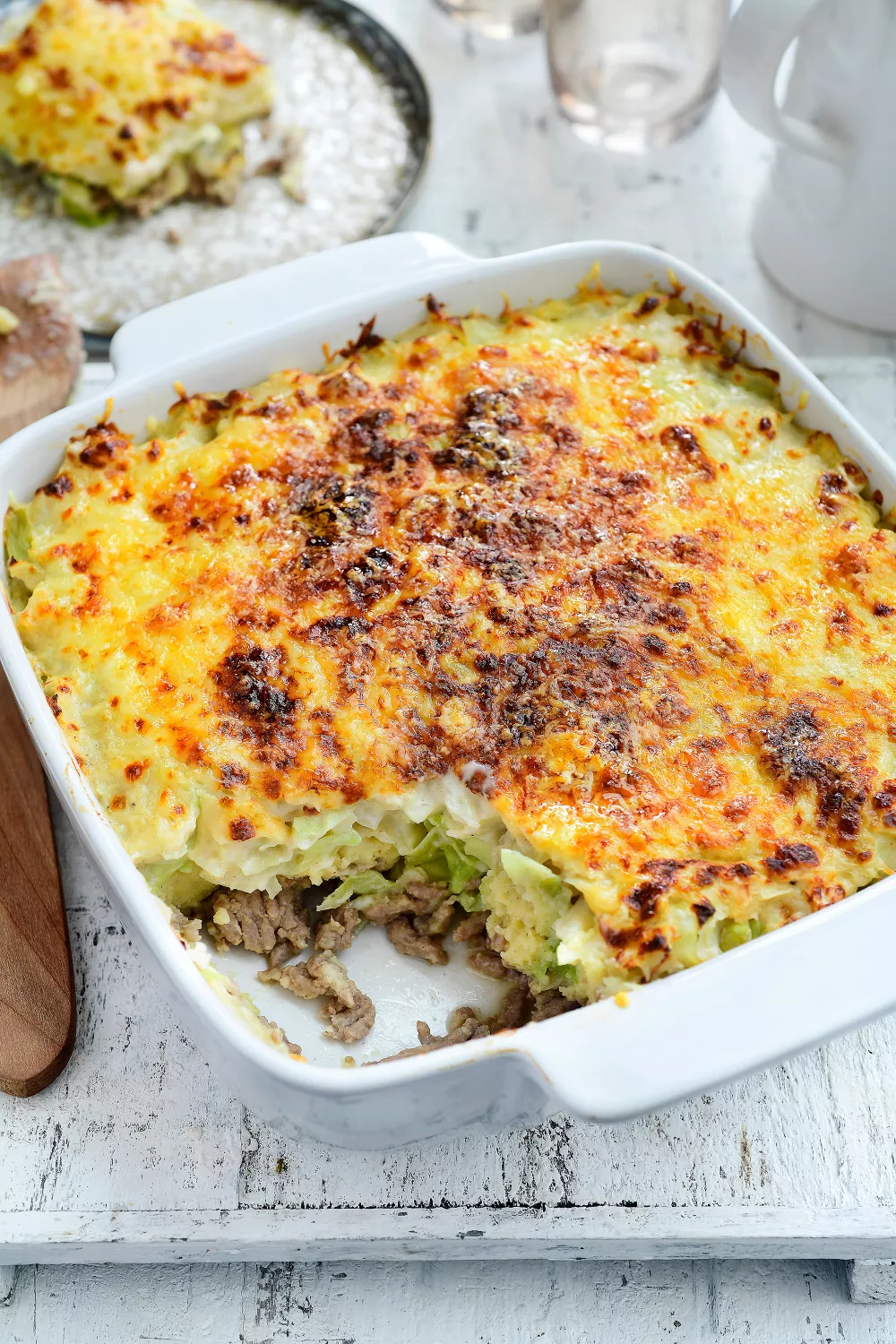 Deze hartige ovenschotel met rul gehakt, zachte spitskool en romige aardappelpuree is een echte comfortmaaltijd voor koele avonden. Een klassieke bechamelsaus bindt de gestoofde kool terwijl geraspte kaas bovenop zorgt voor een goudbruine gratin in de oven. Perfect als doordeweeks familierecept of als winters ovengerecht dat makkelijk voor te bereiden is en rijk vult.