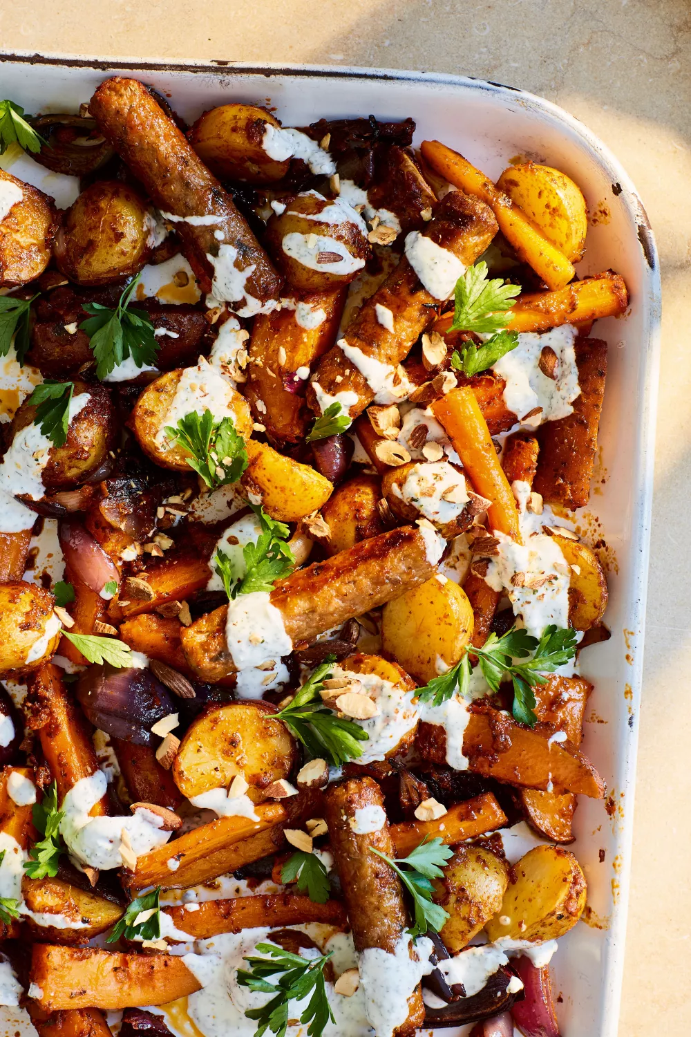 Deze verwarmende ovenschotel met wortels, aardappels en plantaardige worstjes combineert kruidige taginepasta met knapperige geroosterde amandelen en frisse muntyoghurt voor een rijk mondgevoel. Door groente en worst in de braadslee te roosteren ontstaat een stevige herfstige of winterse maaltijd, ideaal voor een gezellig familiediner.