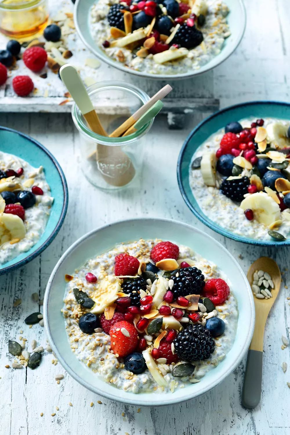 Romige overnight oats met amandelmelk, kaneel en esdoornsiroop als zachte basis voor een gezond ontbijt of zomerse brunch met rood fruit. Zachte banaan en sappige granaatappelpitten geven friszoete contrasten, terwijl geroosterde amandelschilfers, pompoenpitten en zonnebloempitten voor een krokante bite zorgen. Makkelijk voor te bereiden: even mengen, een nacht in de koelkast laten weken en de volgende ochtend afwerken met vers fruit en geroosterde zaden.