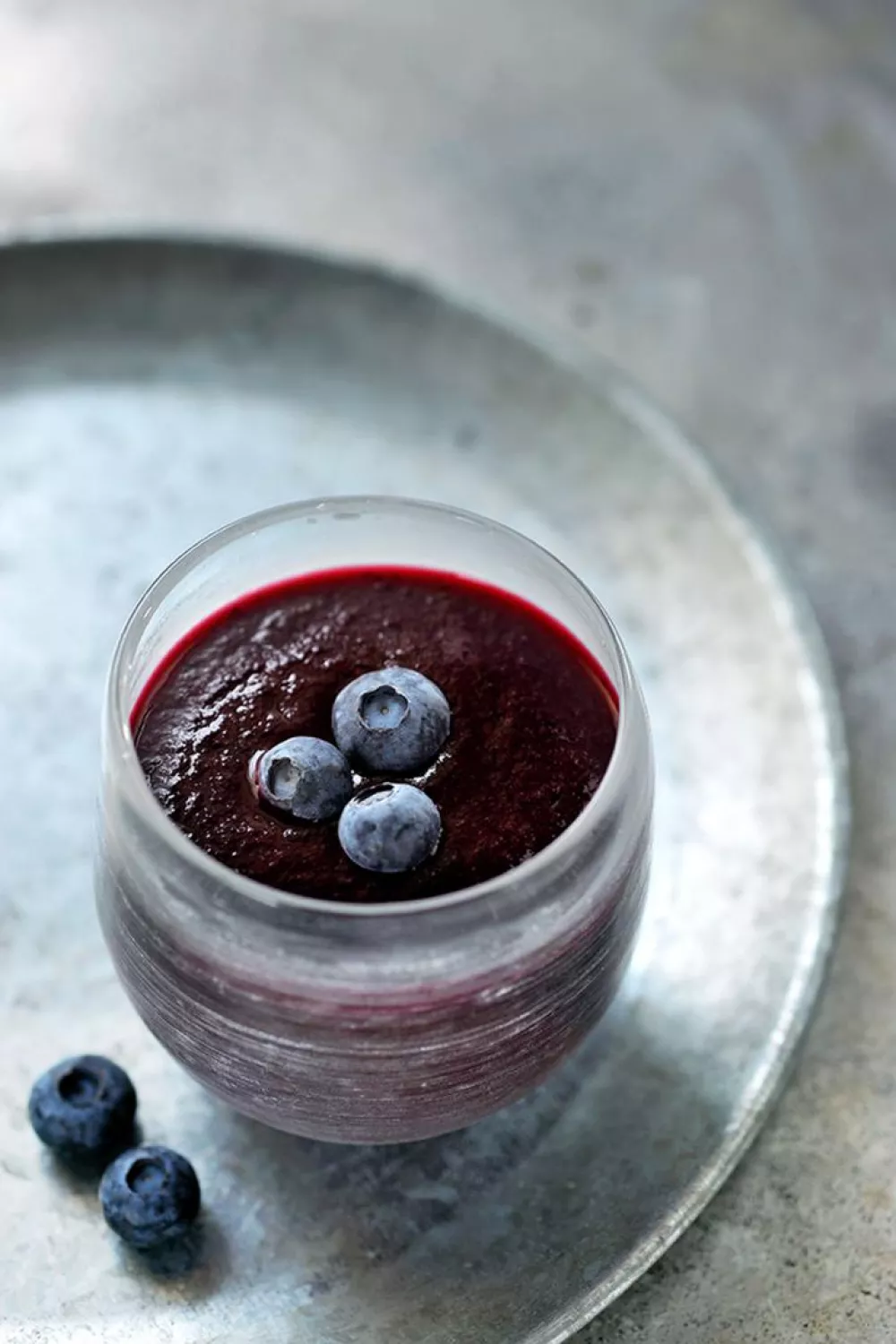 Verdeel de soep over hoge glazen en werk af met enkele bessen.