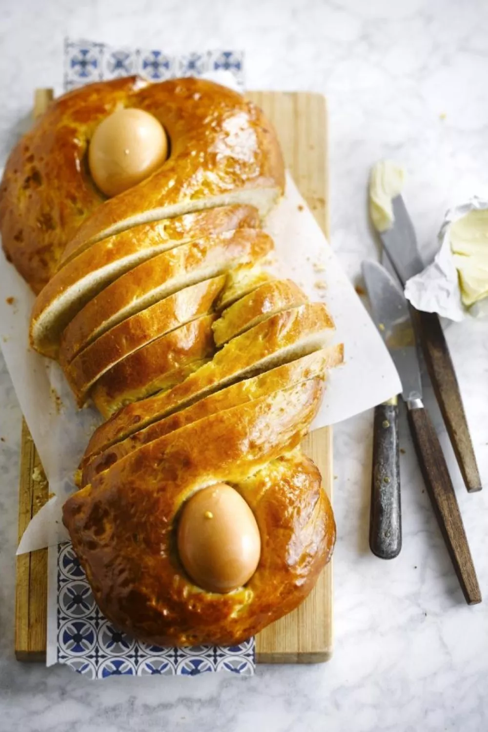 Dit luchtige paasbrood met honing en eieren is perfect voor een feestelijk paasontbijt of lentebrunch. Het zachte, lichtzoete deeg van witmeel, melk en zonnebloemolie kneed je stevig en laat je rustig dubbel rijzen, waarna je het tot een gevlochten krans vormt met eieren in de buitenringen. Een penseel met losgeklopt ei en goudbruin bakken geven het brood een warme, huiselijke smaak.
