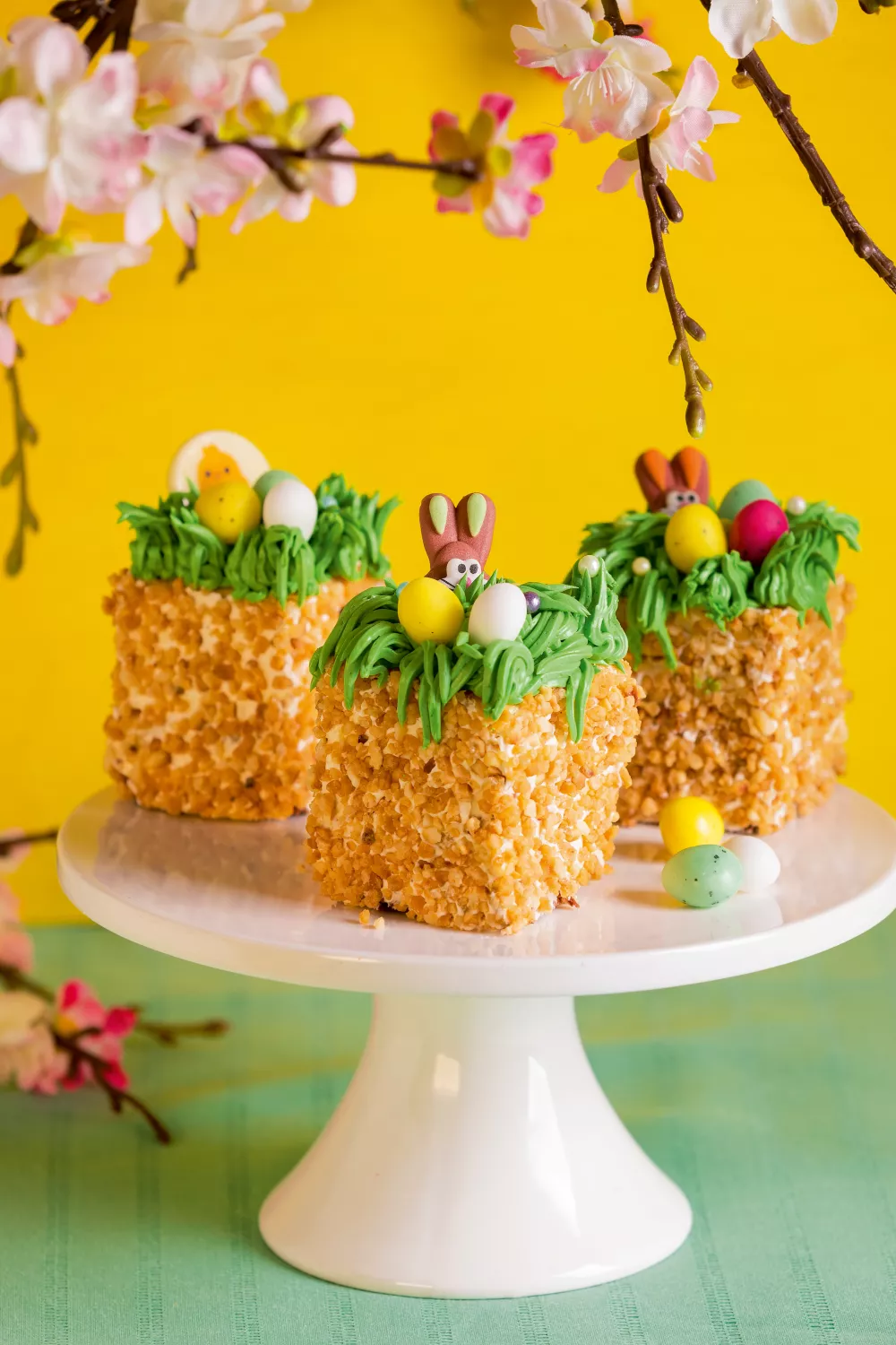 Draai het taartje in de amandelschilfers of bresiliennenootjes. De bovenkant kun je bespuiten met (gekleurde) crème au beurre of afsmeren. Werk verder af met paasdecoratie van suiker en chocolade.
